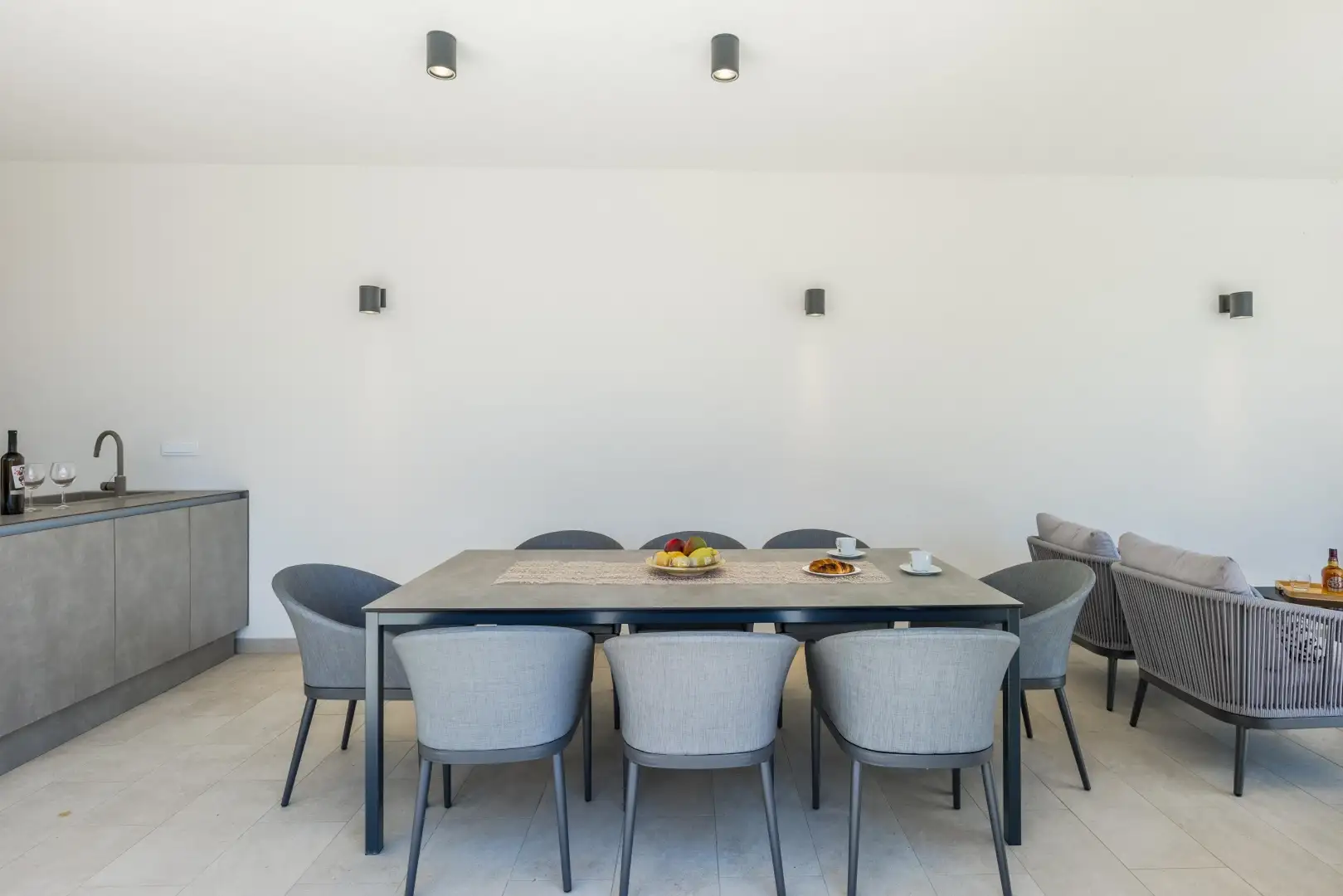На первом этаже находится уютная прихожая, просторная гостиная открытой планировки, наполненная естественным светом, современная кухня с обеденной зоной, кладовая, техническое помещение, гостевой туалет с прачечной и спальня с собственной ванной комнатой и прямым выходом к бассейну. Эта планировка позволяет seamlessly indoor-outdoor living и легкий доступ к благоустроенному саду.