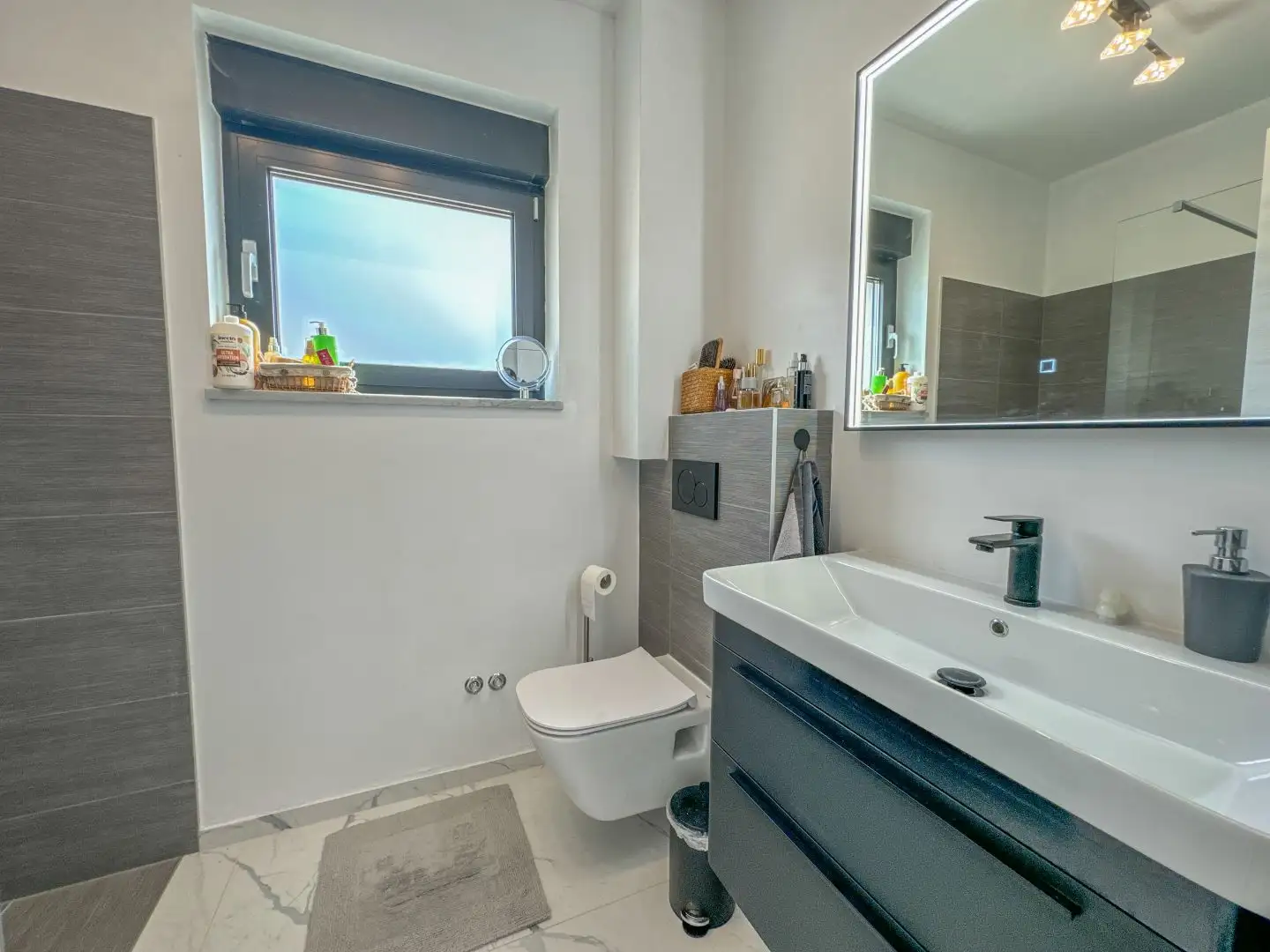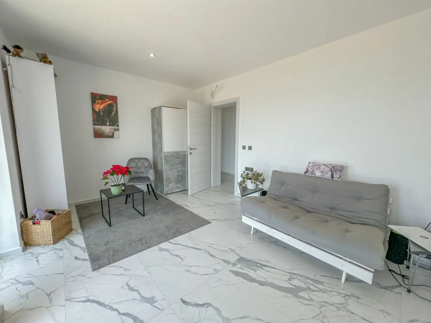 Нижний этаж имеет отдельный вход и включает в себя небольшую гостевую квартиру с двумя спальнями площадью 42 кв.м с выходом в сад, а также таверну/социальную зону/сауну/тренажерный зал площадью 47 кв.м. Эти помещения можно достичь по лестнице, которая проходит вдоль всего участка, так как вилла построена на склоне. Плавный склон позволяет квартире в подвале получать достаточно естественного света и иметь собственную садовую зону, несмотря на свое расположение.