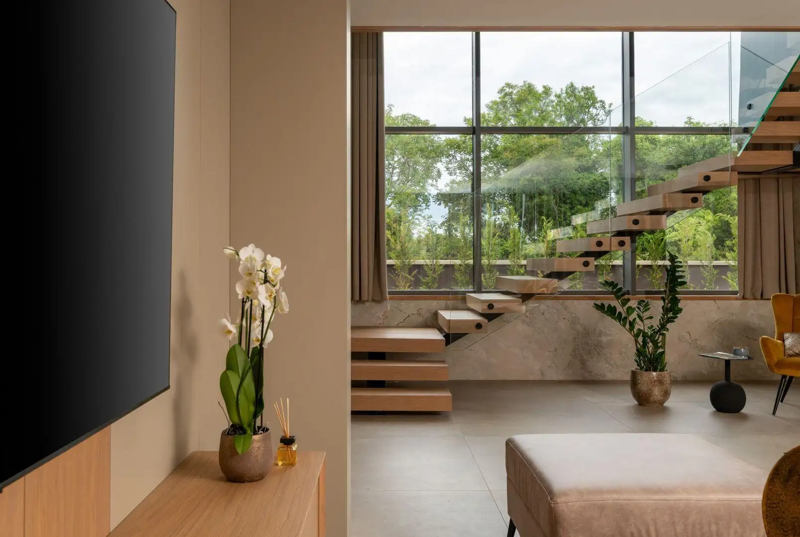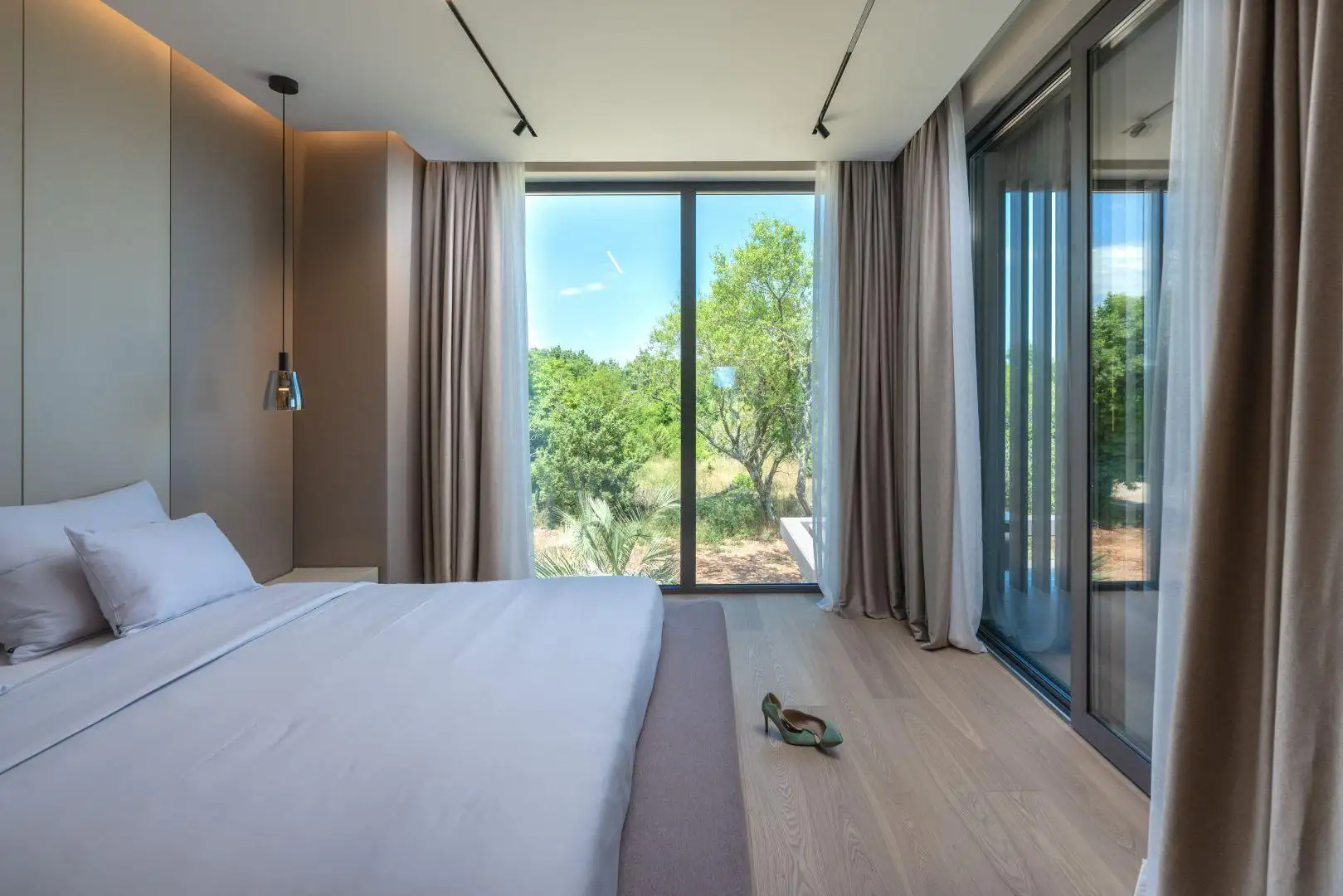 Внутренние лестницы ведут на первый этаж, где расположены три просторные спальни, каждая из которых имеет собственную ванную комнату, гардеробную и выход на крытую террасу. С этого верхнего уровня, а также из сада и первого этажа открываются впечатляющие виды на море и близлежащие острова, создавая поистине захватывающий опыт проживания.
