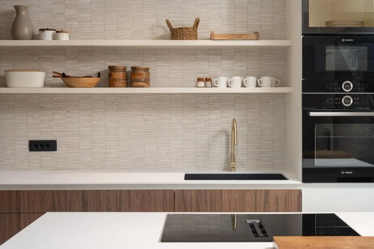 Кухня оборудована современными приборами, включая встроенную кофемашину, винный холодильник, вытяжку на уровне пола и премиальные аксессуары. Все строительные и отделочные материалы, включая деревянные конструкции, были выбраны за их эстетические качества, долговечность и энергоэффективность.