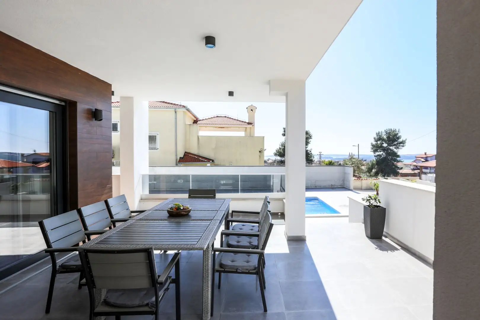 Терраса на крыше площадью 100 м² подготовлена для установки джакузи – все необходимые подключения доступны, а конструкция потолка усилена. Она предлагает фантастический открытый вид на море.