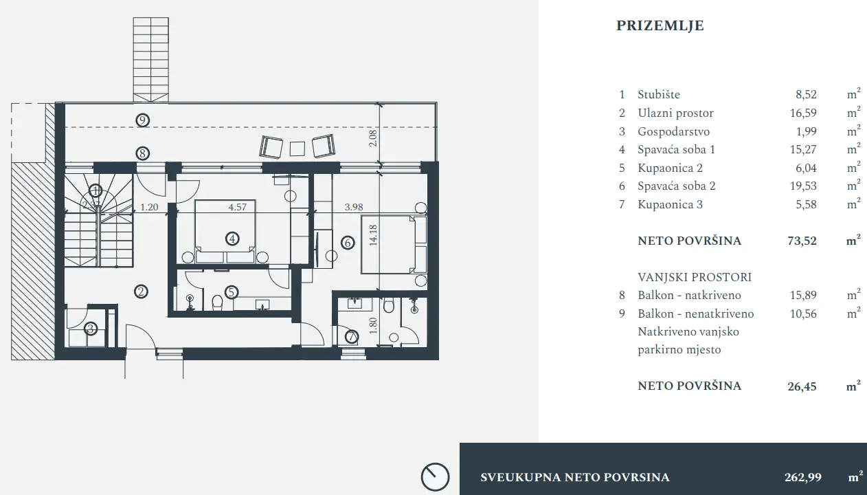Недвижимость также обладает большим балконом, соединяющим обе спальни, а также крышей-террасой, идеально подходящей для отдыха и наслаждения непрерывными видами на море.