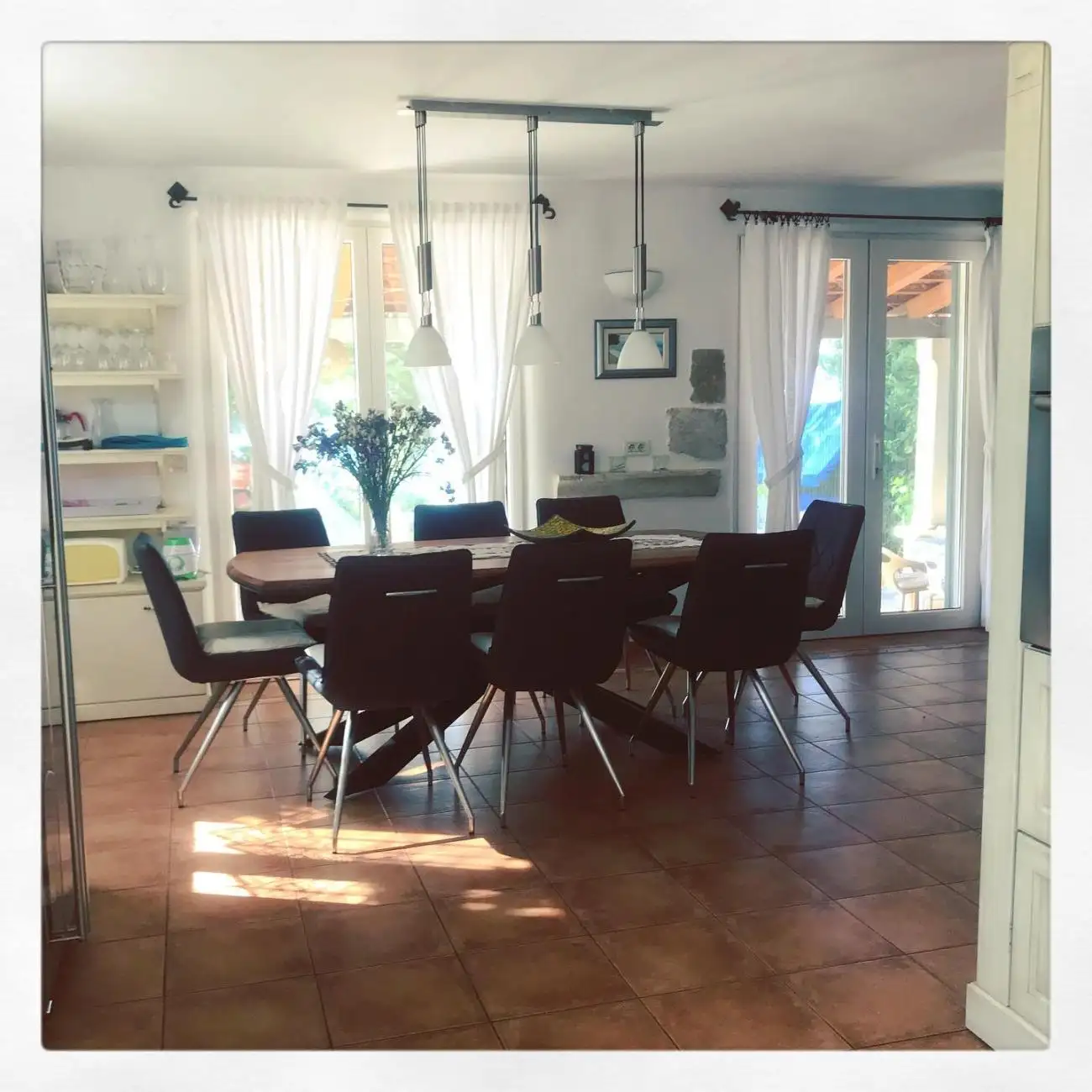 На первом этаже виллы находится современное открытое пространство, которое включает в себя полностью оборудованную кухню с хлебопекарной печью, столовую и уникальное салонное пространство с каменным камином в деревенском стиле. Все это пространство наполнено тщательно продуманным интерьером, который является результатом удачного сочетания современного и традиционного средиземноморского стиля, а большие двери в стиле «прованс», ведущие в прекрасный сад и на террасу с видом на море, придают дополнительную ценность и специфику этому помещению. космос. На первом этаже также есть гостевой туалет и современная ванная комната с джакузи.