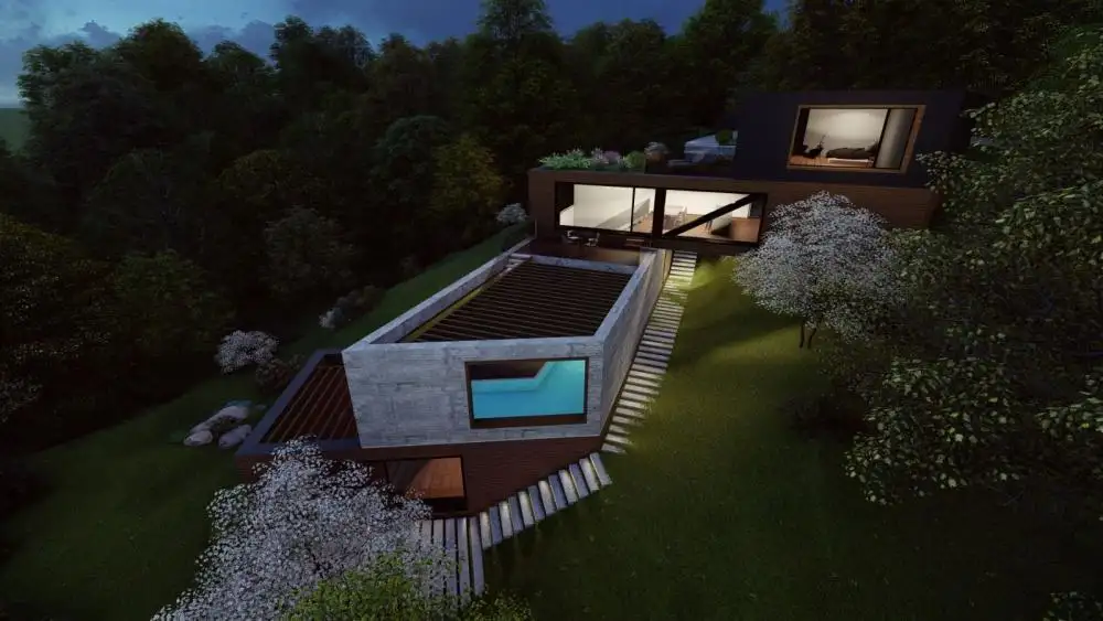 Вилла распределяет свою жилую площадь через цокольный, первый и второй этажи, образуя таким образом кухню и гостиную с концепцией открытого пространства, три спальни с собственными ванными комнатами, отдельный гостевой туалет, комнату отдыха и оздоровительный оазис, а также как кладовая и гараж. Из главной спальни и гостиной есть выход на просторную террасу, с которой открывается потрясающий вид на зелень и старый город Лабин.