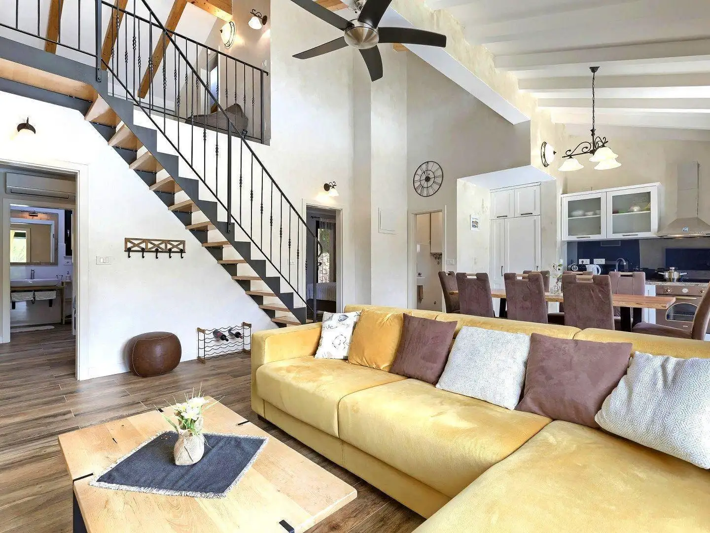 Неподвластный времени дизайн домов органично сочетается с деревней и окружающим ландшафтом как по форме, так и по цвету. Каждый дом продуманно спроектирован как со вкусом оформленный и хорошо оборудованный жилой комплекс. Главный дом занимает два этажа: на первом этаже находится пространство открытой планировки, объединяющее кухню, столовую и гостиную, а также гостевой туалет и две спальни, каждая со своей ванной комнатой. В лофте есть галерея и дополнительная спальня с собственной ванной комнатой.
