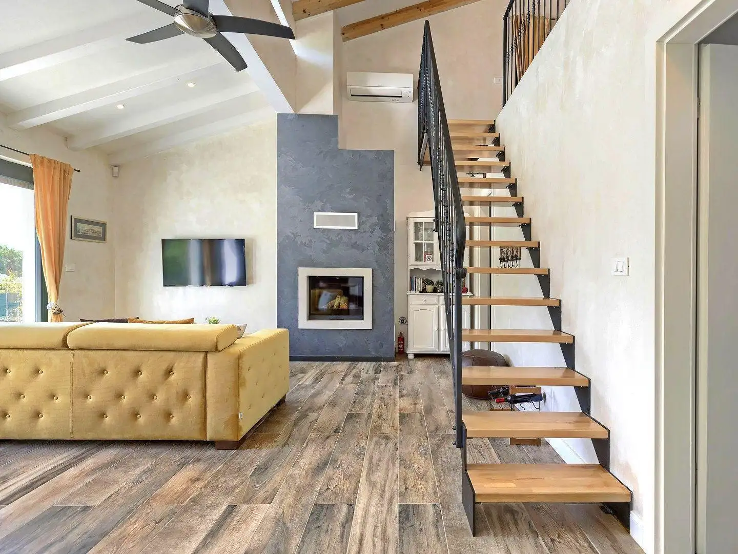 Гостевой дом, расположенный на одном этаже, состоит из гостиной с кухней, спальни и ванной комнаты. Между двумя домами находится летняя обеденная зона, крытая беседкой и с открытым камином. Идеальную гармонию дополняет бассейн с морской водой площадью 32 м² и солярием.