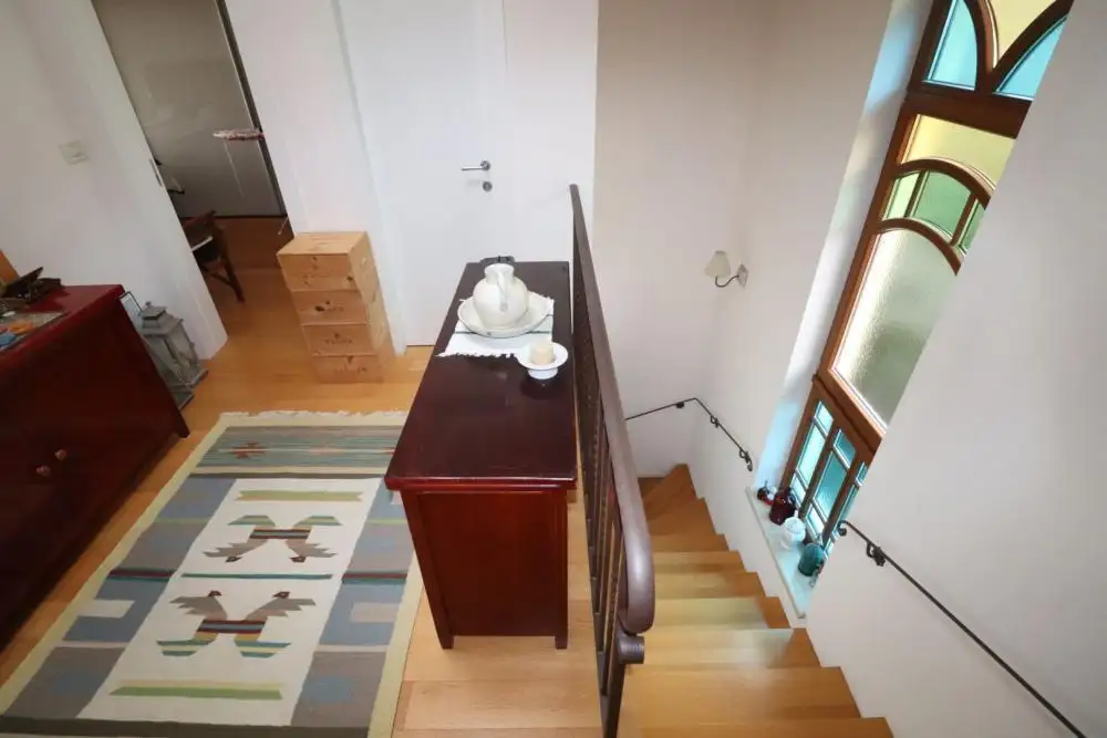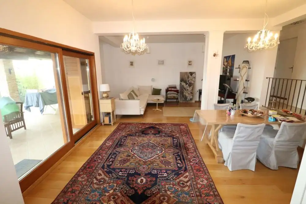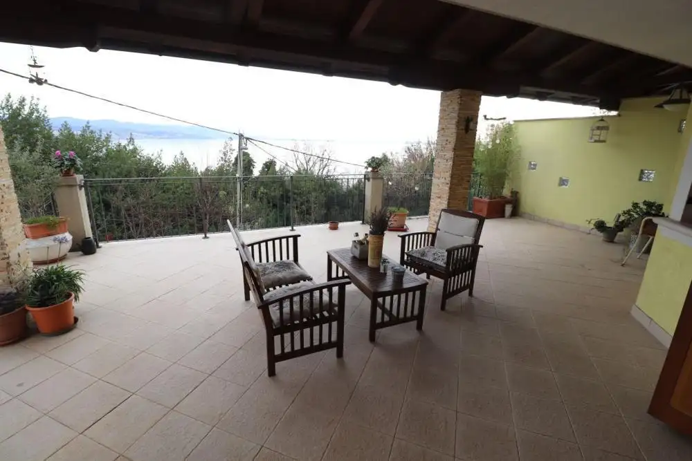 На самом деле это двухквартирная вилла. Она состоит из двухэтажной квартиры, однокомнатной квартиры, таверны, гаража и сада.