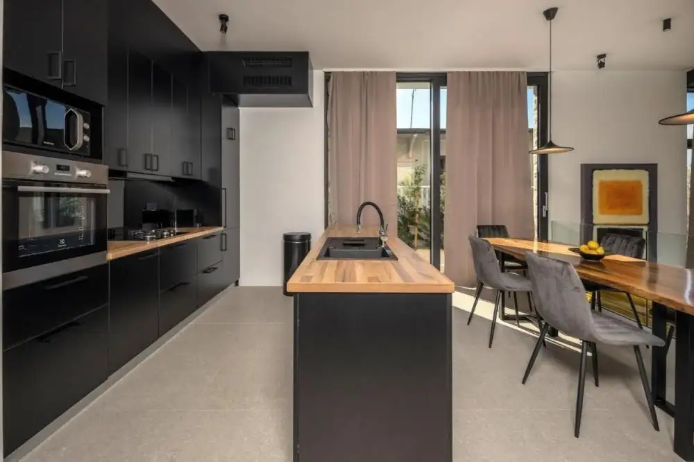 На нижнем этаже виллы расположены полностью оборудованная кухня, столовая и гостиная, оформленные в виде открытого пространства. Стеклянная стена в гостиной позволяет пропускать много света в течение всего дня, а на террасе также есть прекрасный бесконечный бассейн. С террасы, а также из всех комнат виллы открывается потрясающий вид на близлежащие острова, Адриатическое море и закат. На нижнем этаже виллы также есть дополнительный туалет и прачечная.