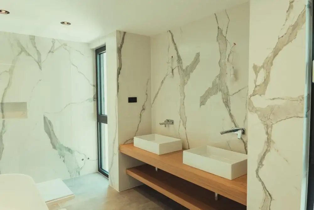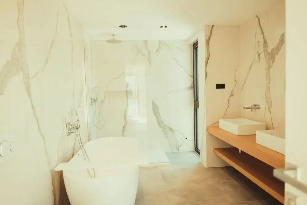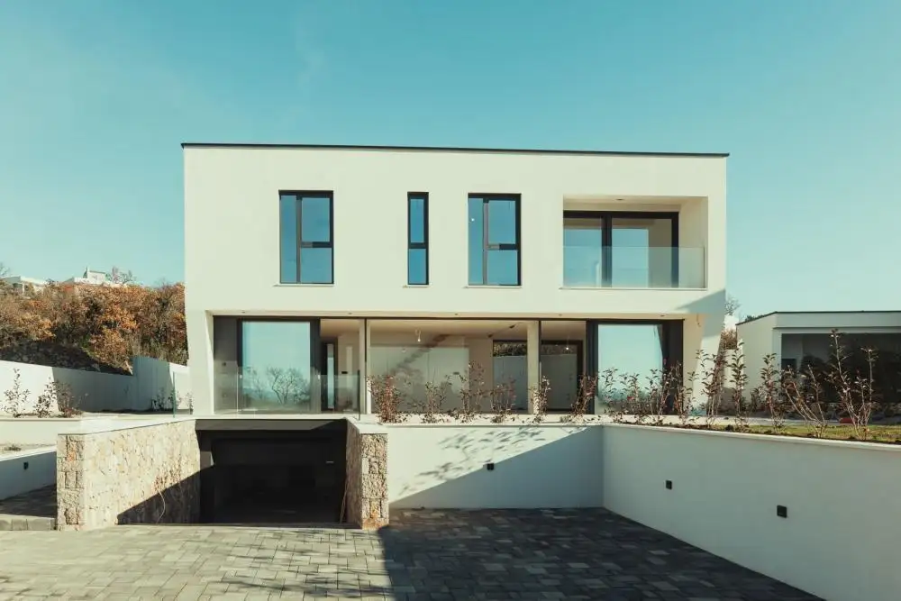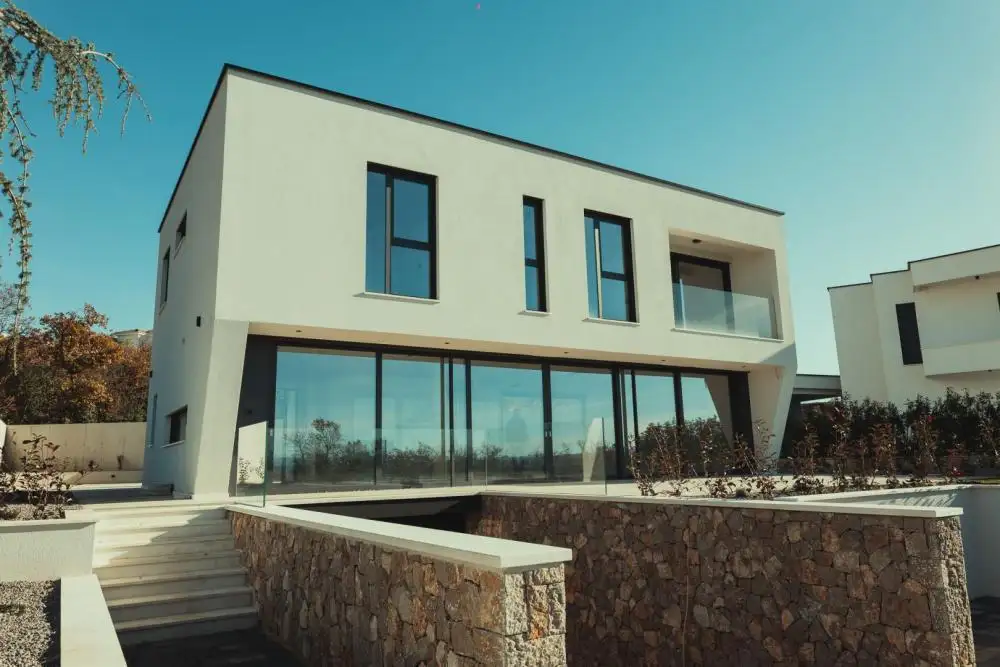 Внешне вилла излучает изысканность благодаря столярным изделиям системы Schuco с безопасным низкоэмиссионным стеклом, электрическими жалюзи Roltek с приводом от современных двигателей Somfy и дополнительным удобством противомоскитных сеток. Плоская крыша, покрытая пленкой ТПО, дополнена утеплителем толщиной от 16 до 26 см, дополненным речным камнем для дополнительной изоляции, и листами крыши, увенчанными желобами. Фасад, великолепный в системе STO (система STOSILCO K 2 мм), завершается полированной отделкой.