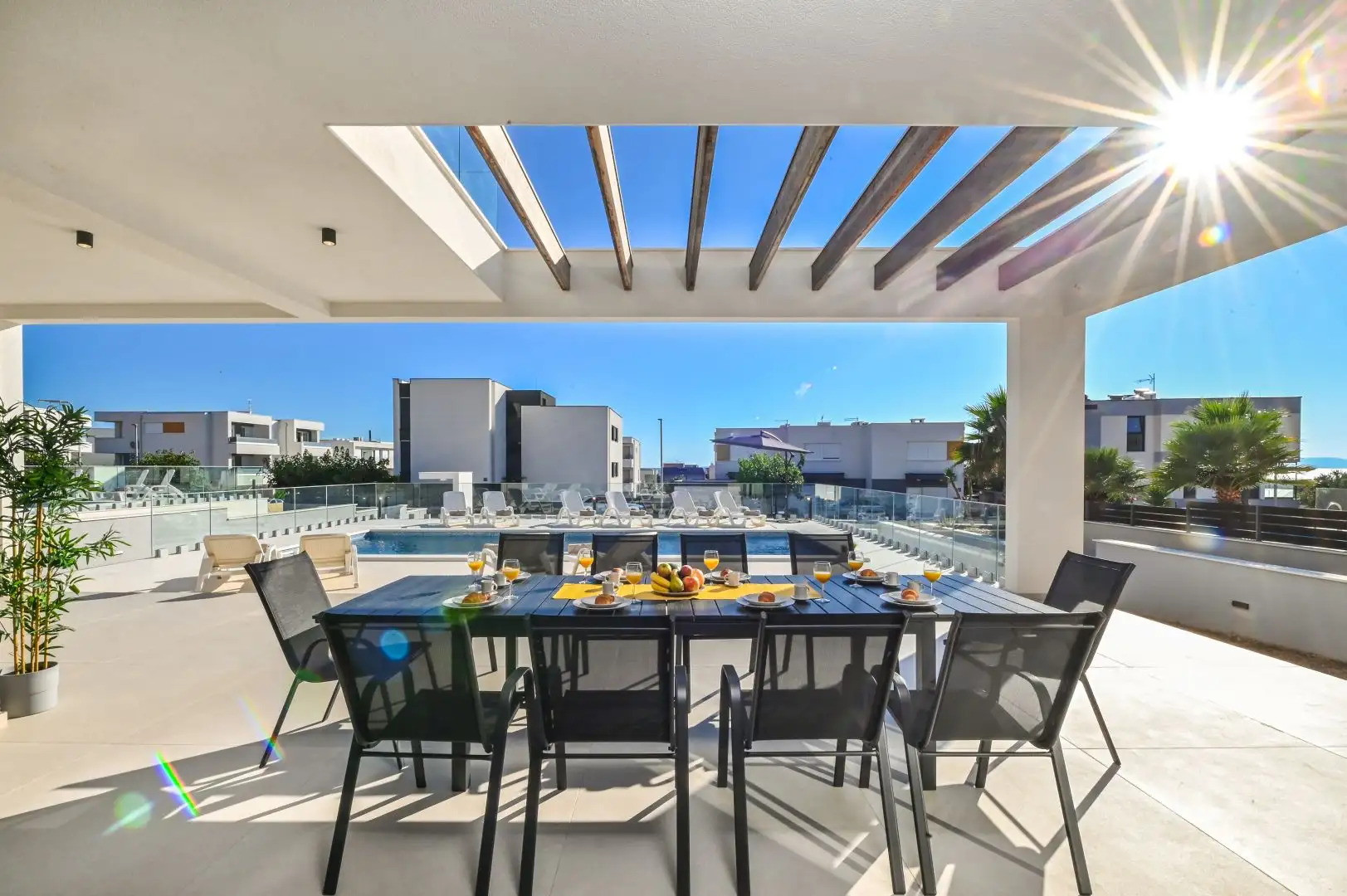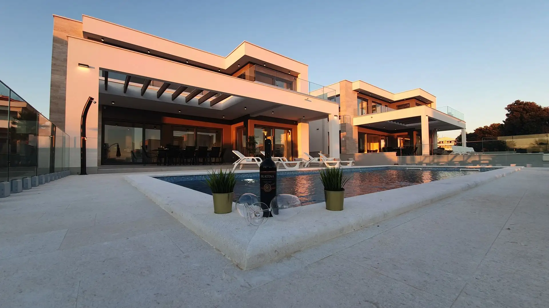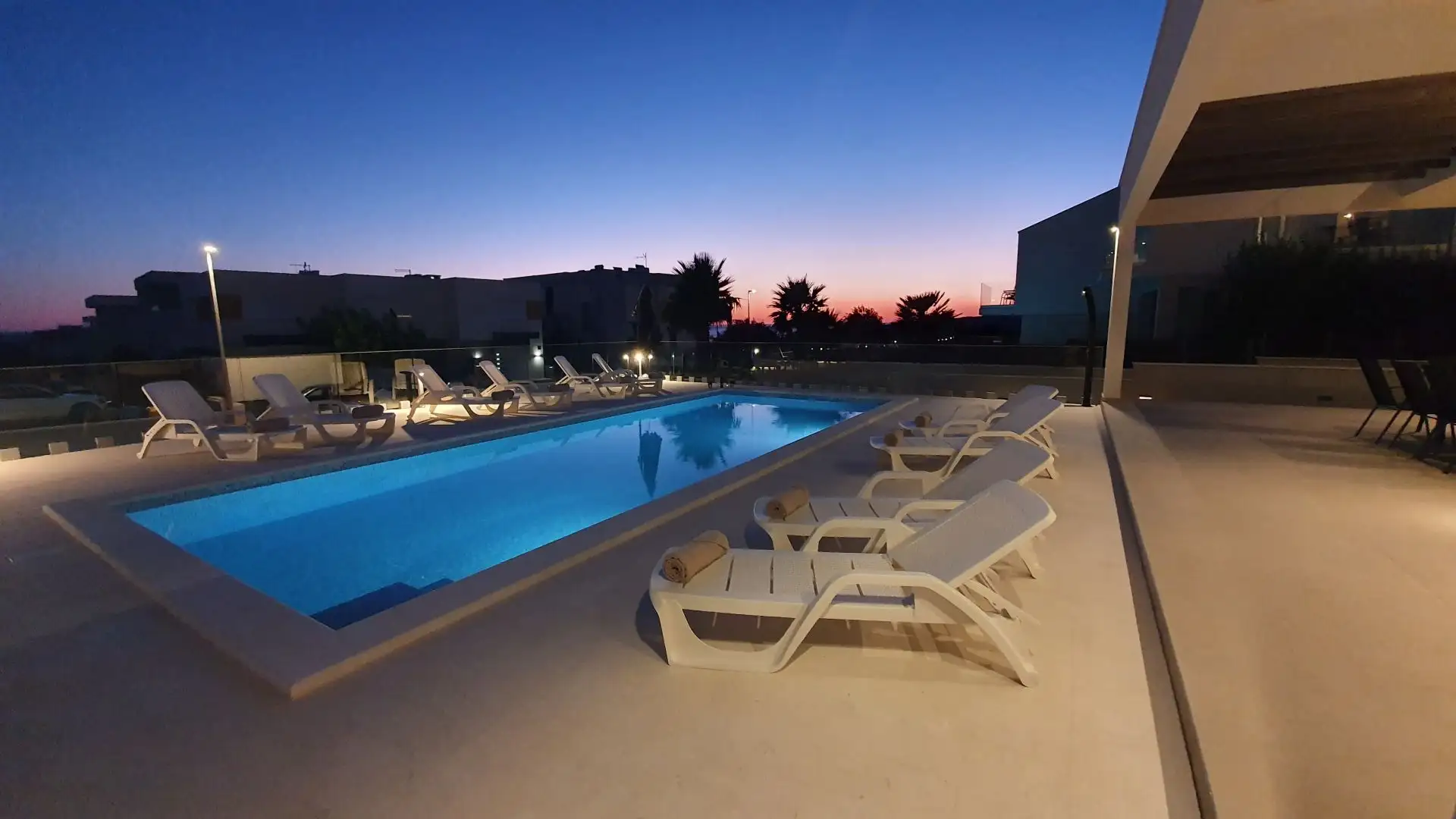 - Роскошный бассейн и открытая площадка: подогреваемый бассейн размером 10 х 4 м , солнечная терраса с мраморным полом, частная парковка на 3–4 машины , ландшафтный сад с пальмами и зона барбекю .