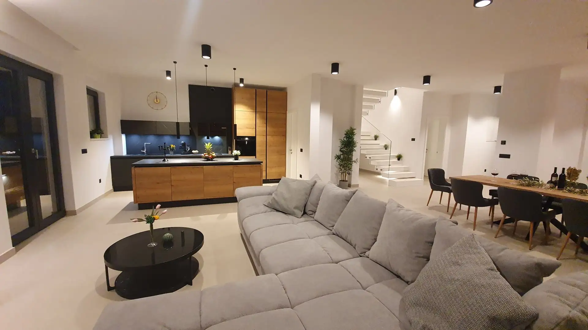 - Современная архитектура: раздвижные окна XXL, потолки высотой 3 м, моноблочная лестница, мраморный пол.