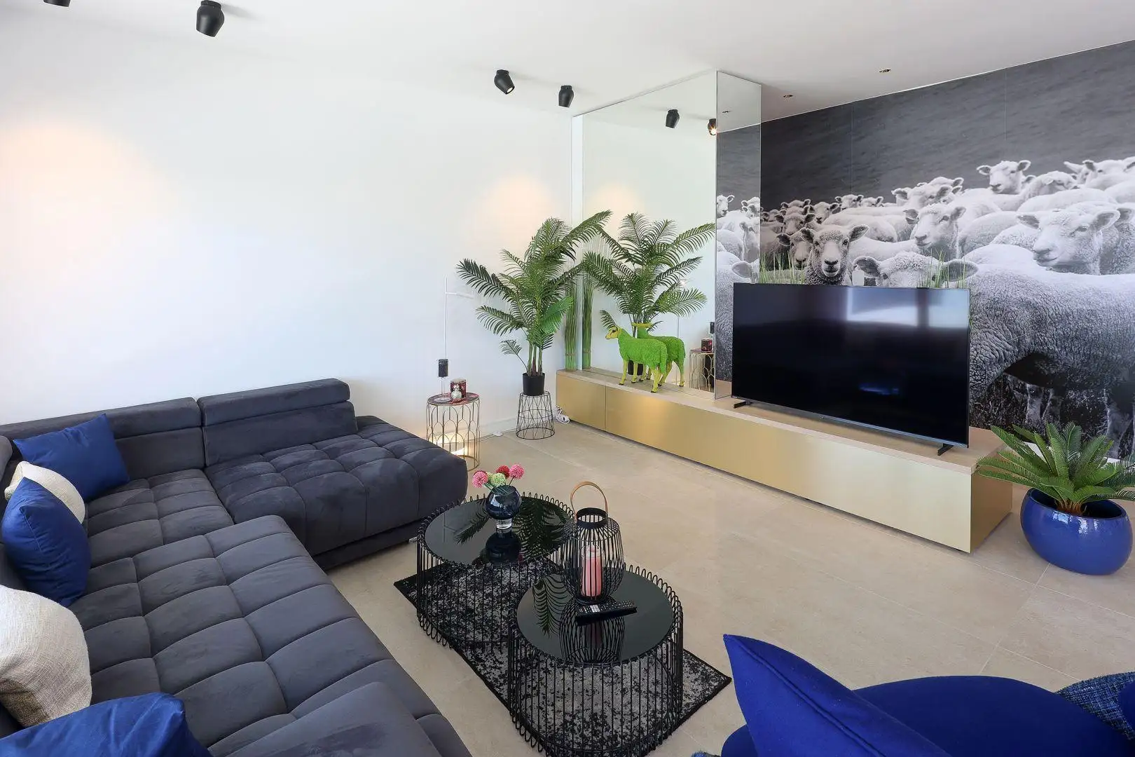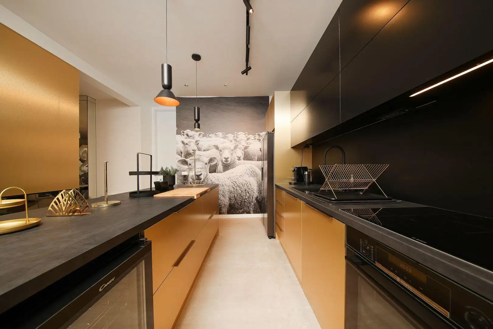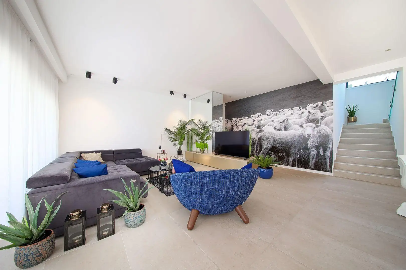 На первом этаже вы попадаете в просторную гостиную, которая плавно переходит в столовую и современную кухню.