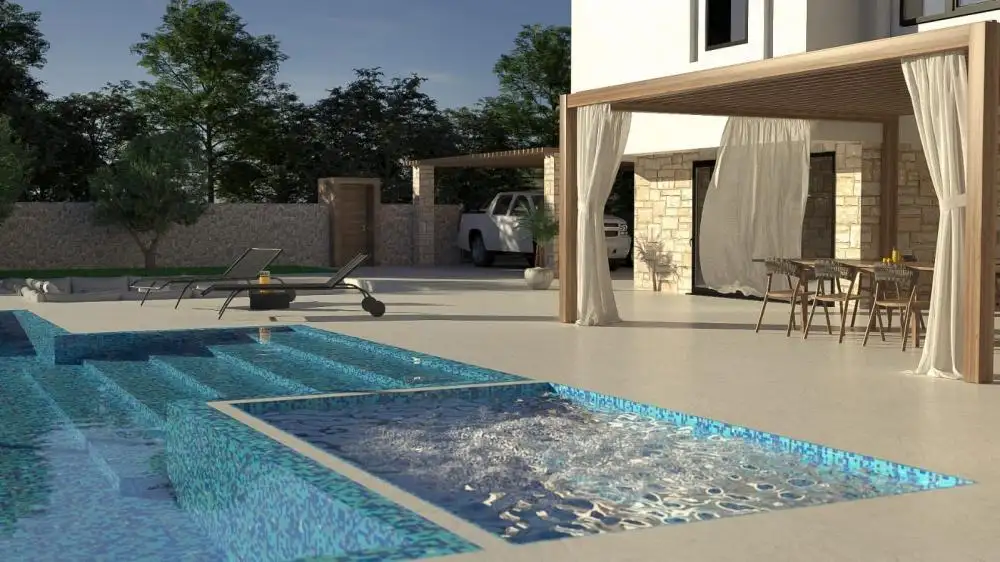 Безусловно, особой жемчужиной этой виллы будет экстерьер, в котором будет выделяться большой переливной бассейн площадью 60 м2, в котором будет отдельное джакузи. Бассейн будет с подогревом, с соленой водой, водопадом и ледяной подсветкой в цветах и душем. Рядом с бассейном будет место для отдыха у костра, которое будет на одном уровне с солярием.