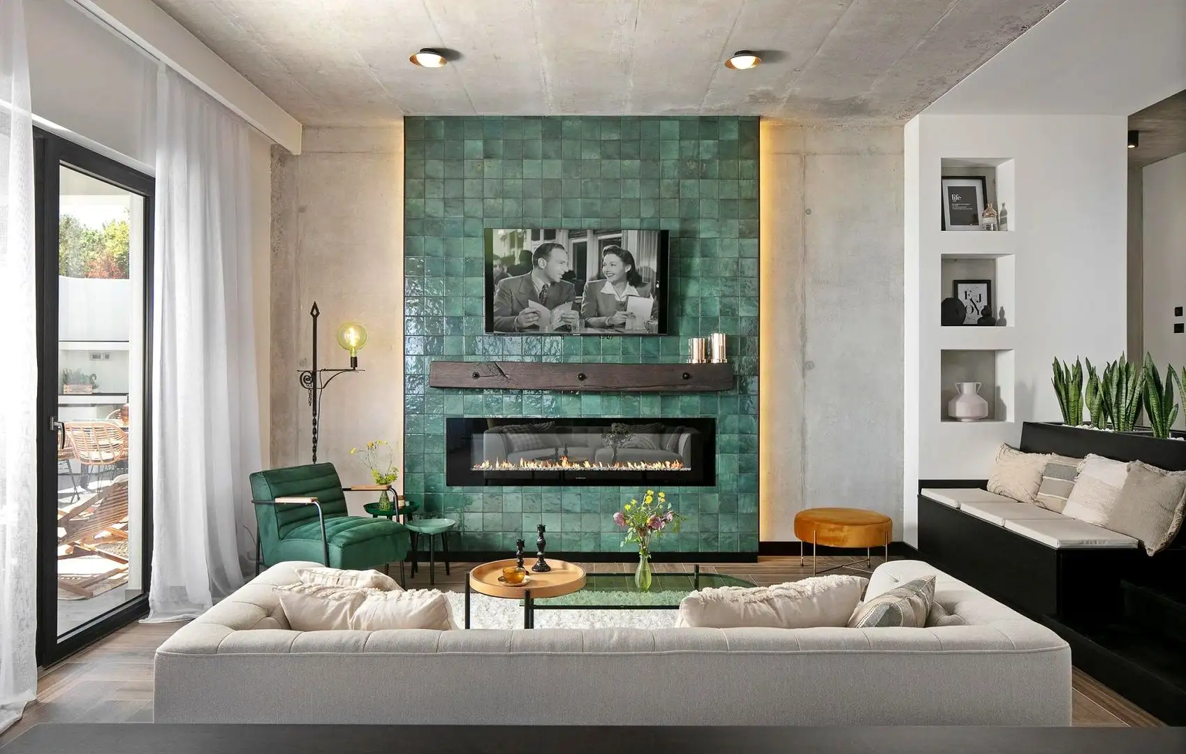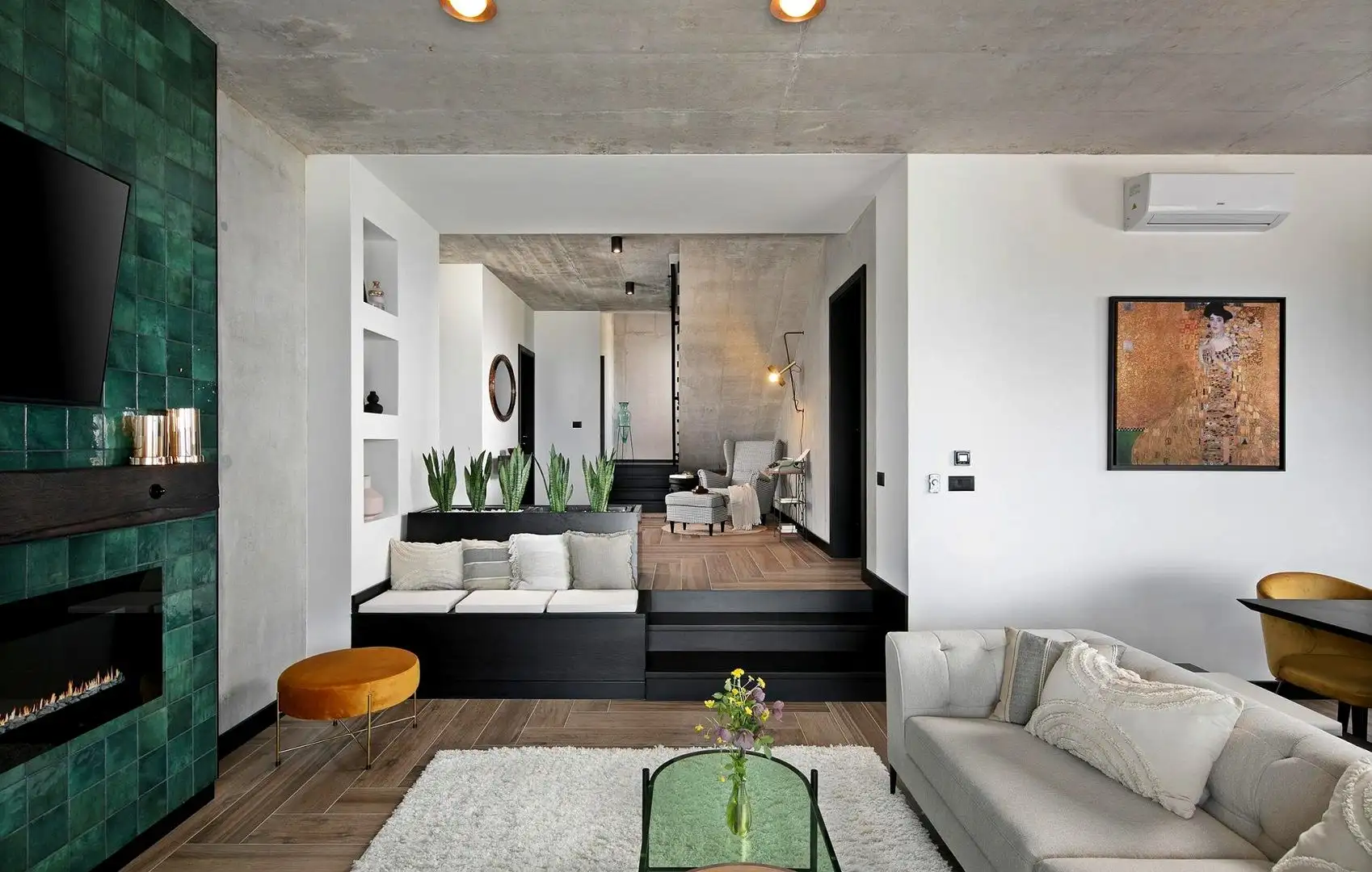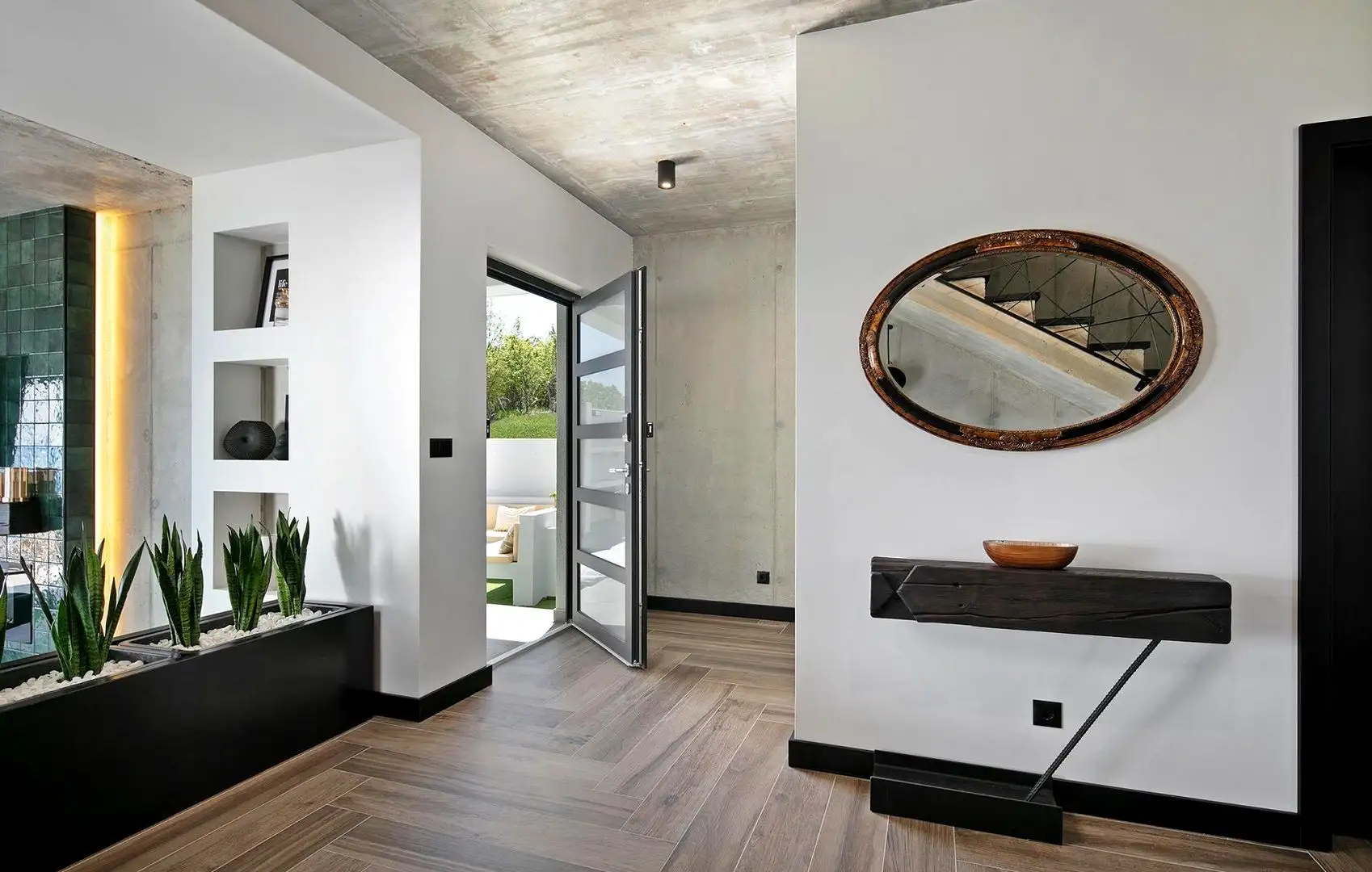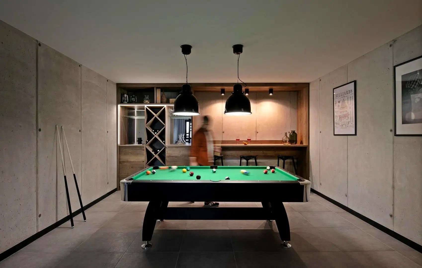 На трех этажах интерьер имеет функциональную, воздушную и открытую планировку, с акцентом на комфорт и элегантность. Большие стеклянные стены пропускают много естественного света и демонстрируют пейзаж. Высококачественная мебель и оборудование тщательно интегрированы, улучшая как стиль, так и практичность.