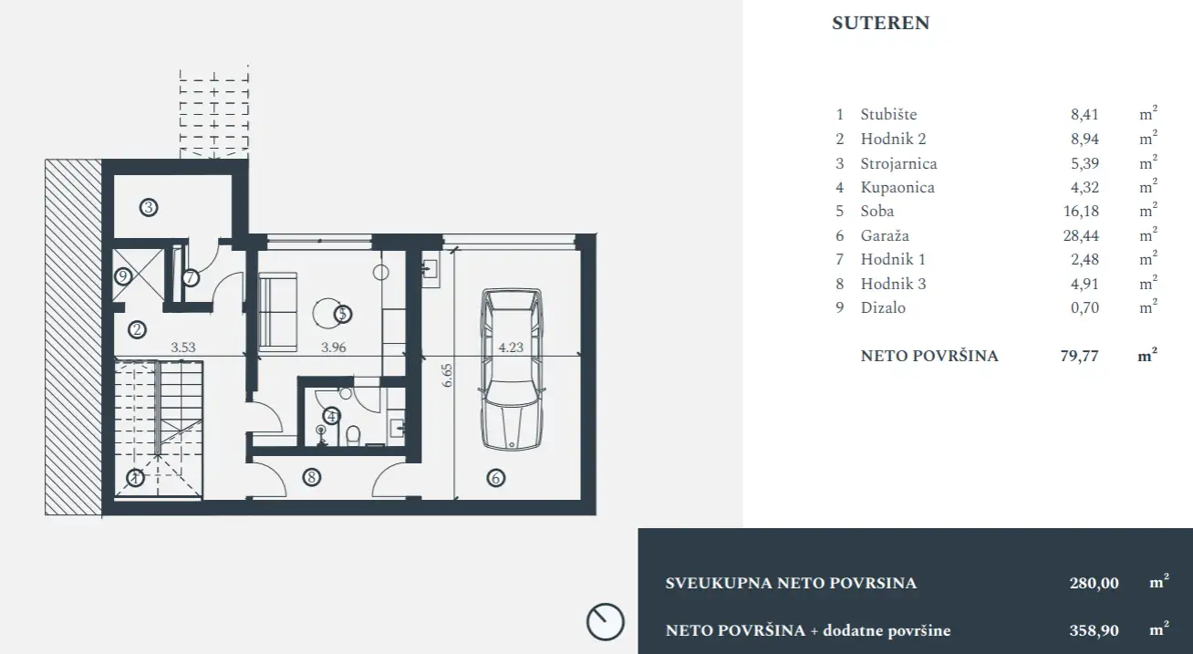 Нижний этаж: подсобное помещение, ванная комната, жилая зона и гараж.