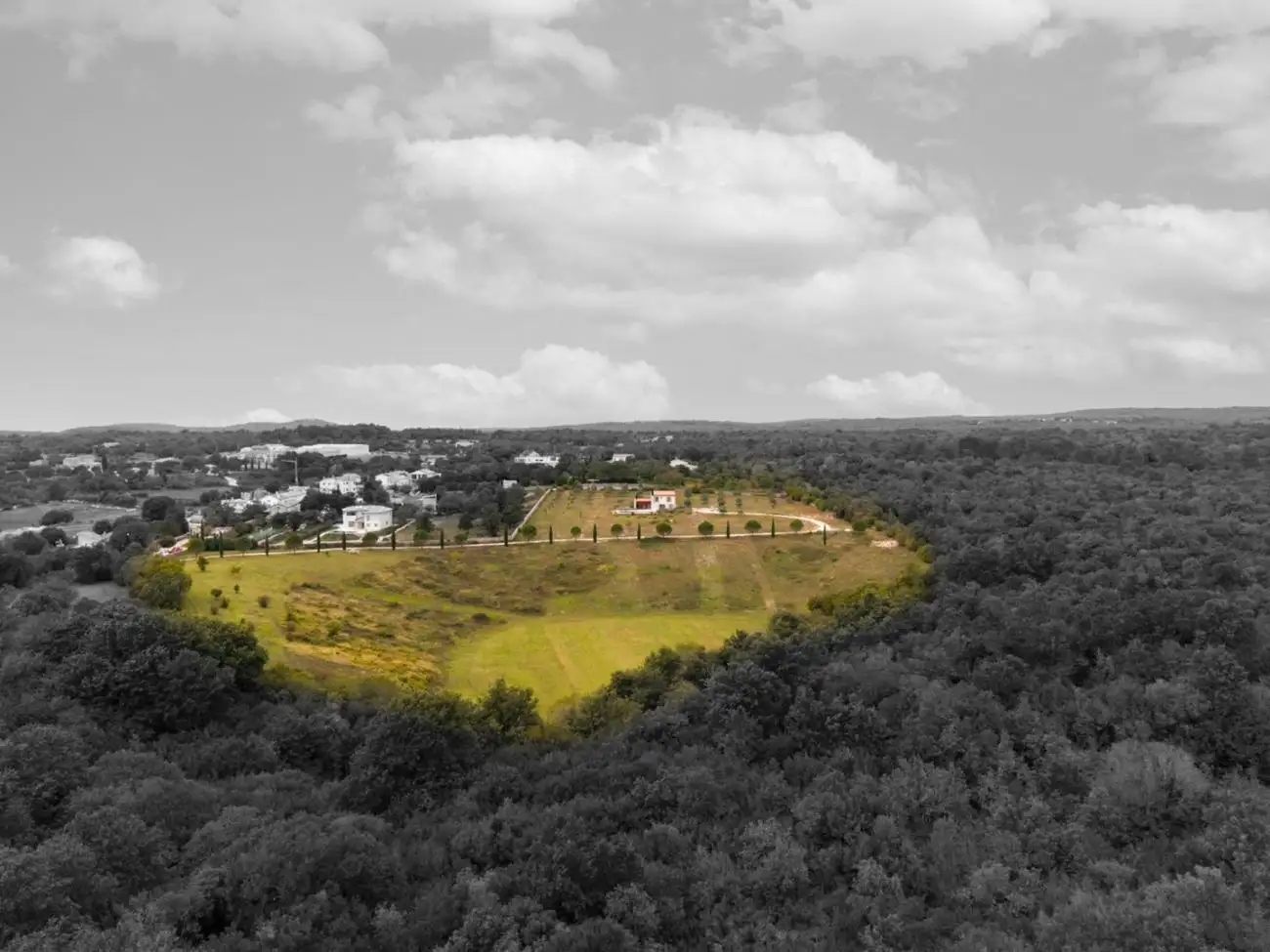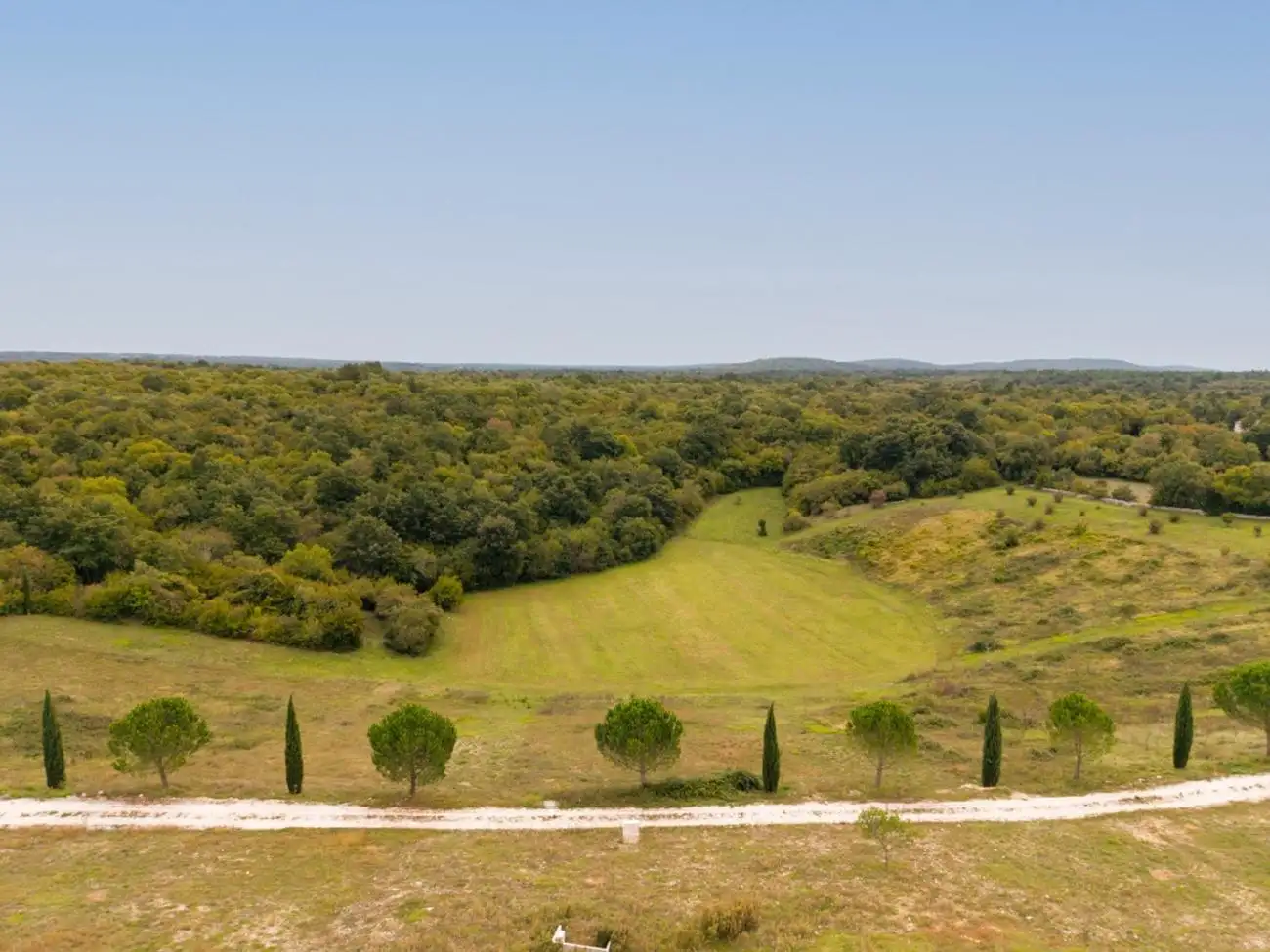 Земля частично обработана и уже засажена 55 оливковыми деревьями, которые производят до 250 кг плодов в год, давая около 30 литров оливкового масла первого отжима. Рельеф и склон очень подходят для виноградников и производства вина. Вся собственность окружена традиционной сухой каменной стеной высотой до двух метров, обеспечивая уединение и характерный средиземноморский стиль, а также имеет организованную подъездную дорогу и благоустроенные окрестности.