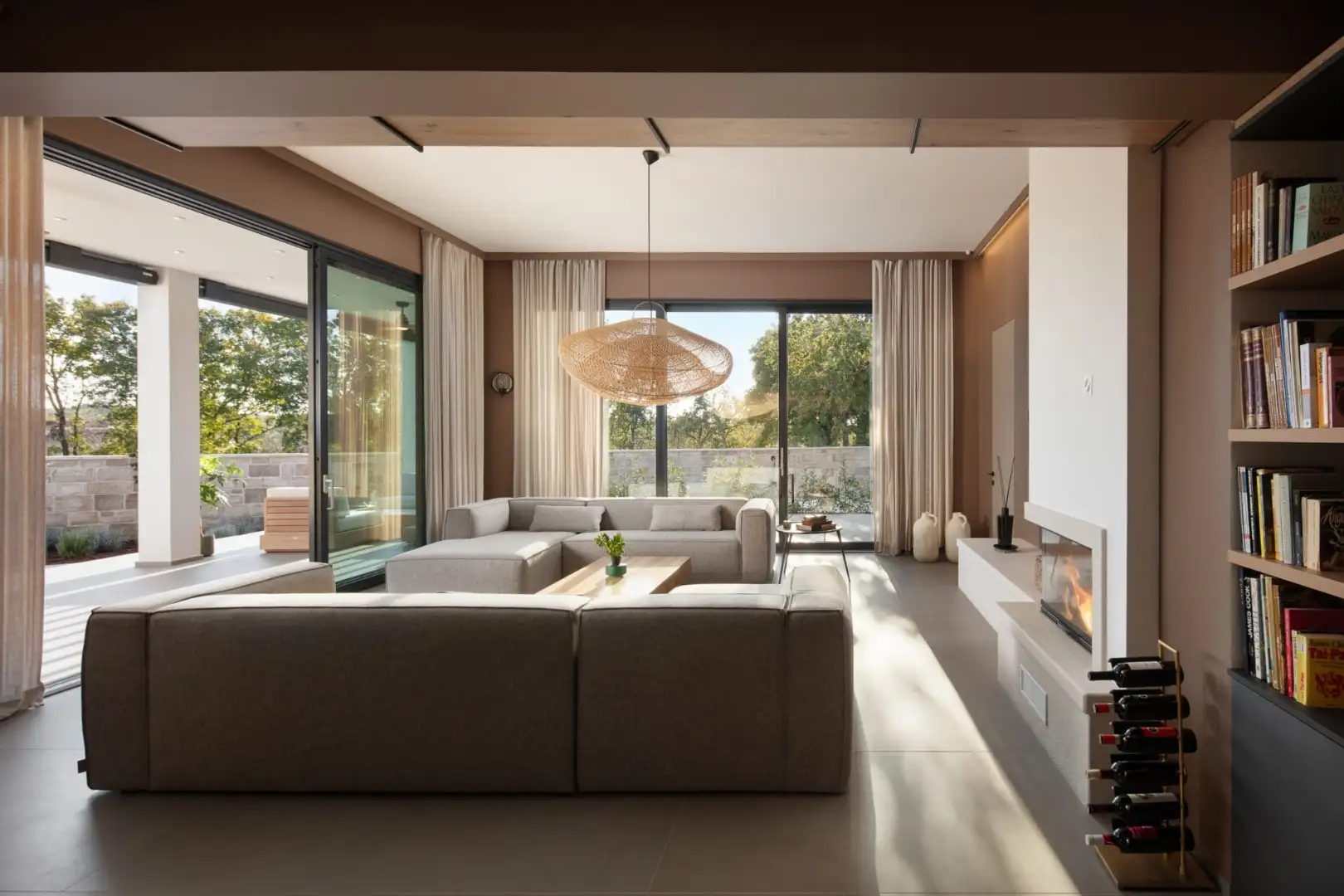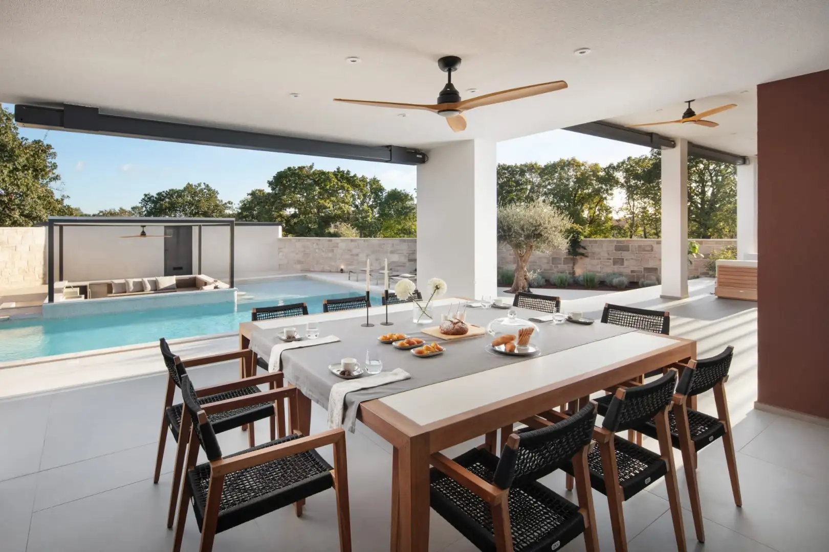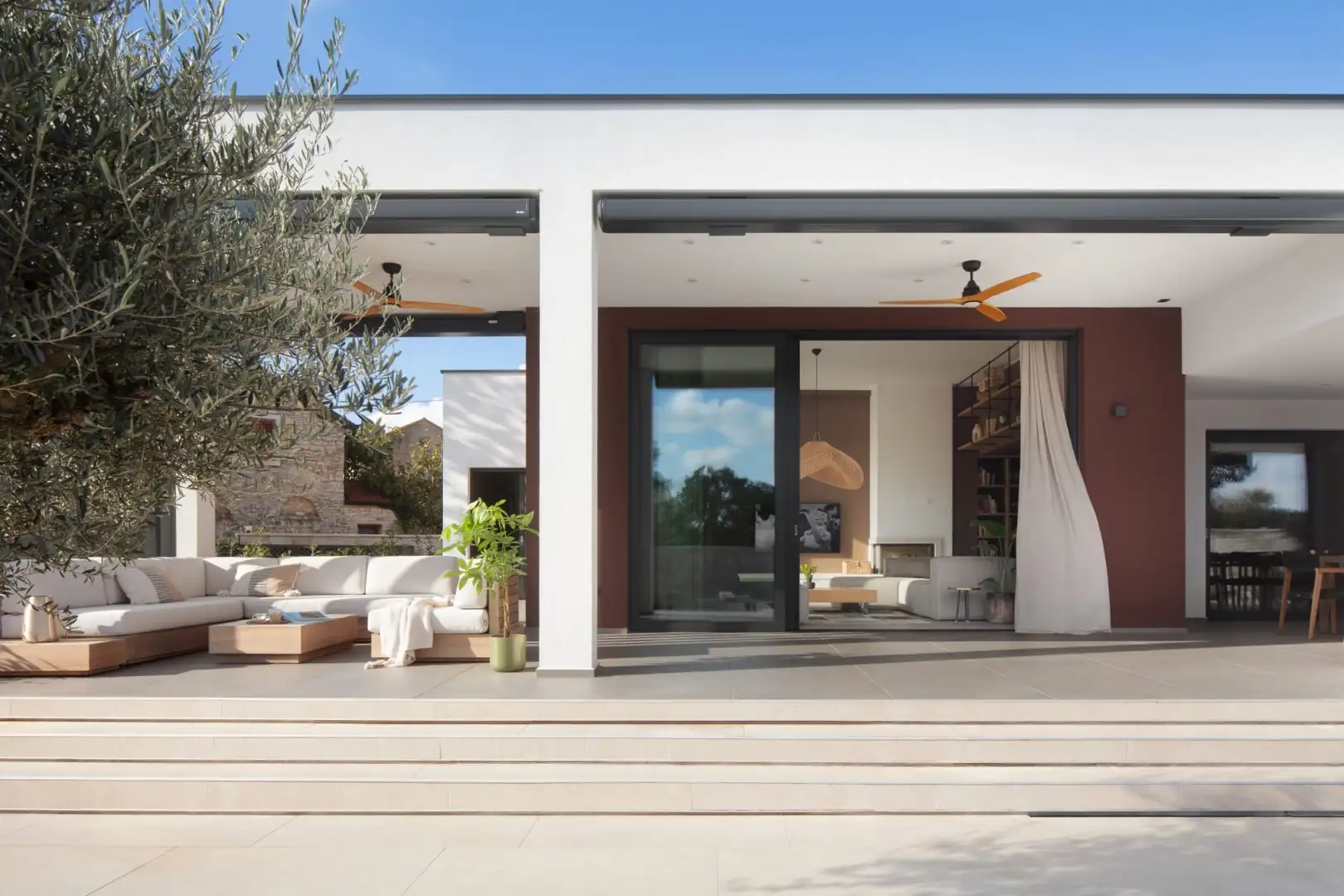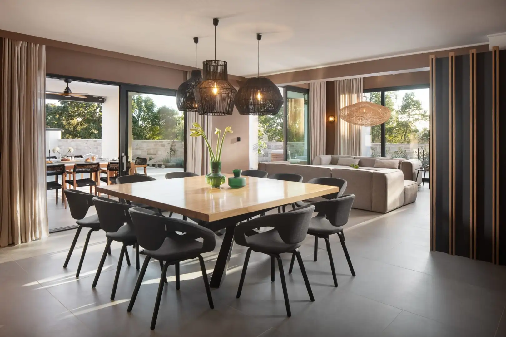 Внутри вилла спроектирована с учетом открытой концепции. Просторная гостиная, столовая и полностью оборудованная кухня плавно переходят друг в друга в ярком, залитом солнцем пространстве с большими раздвижными стеклянными стенами, которые открываются на роскошную террасу. Этот бесшовный переход между внутренним и внешним пространством создает естественную связь с окружающей средой.