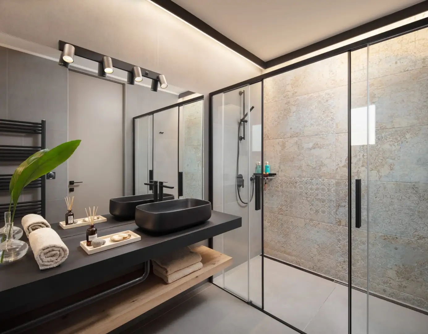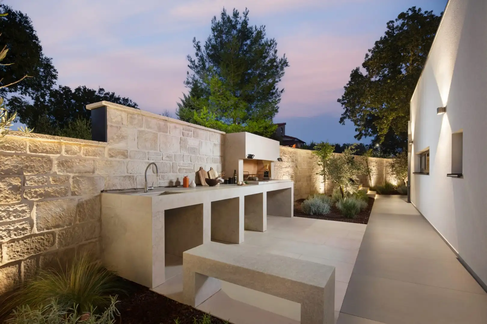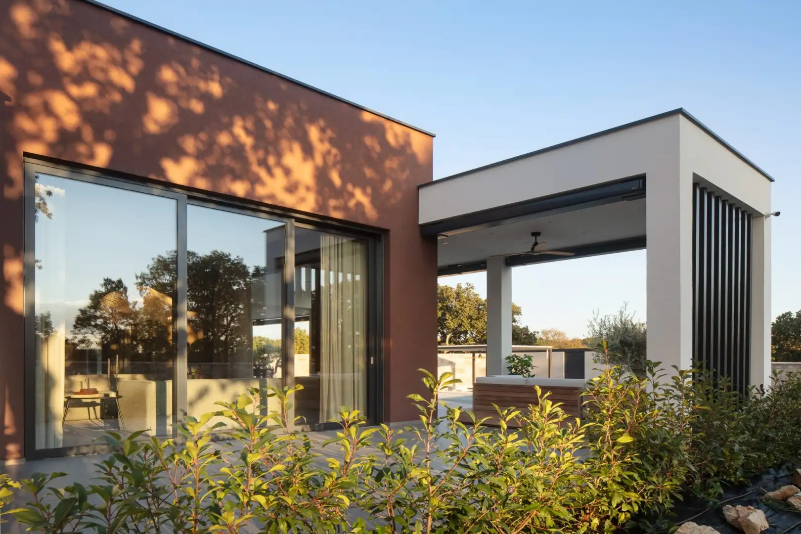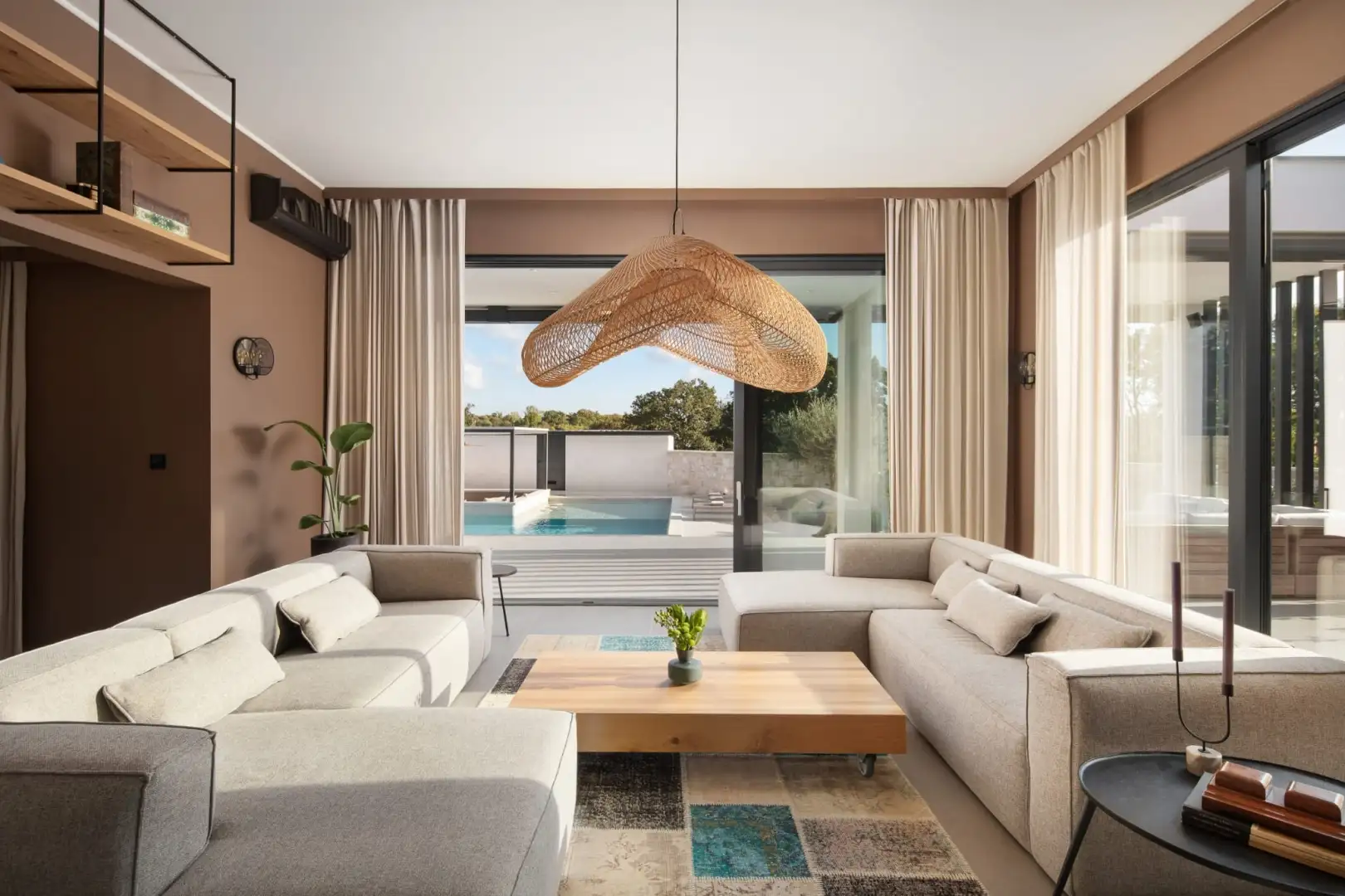 Внутри вилла спроектирована с учетом открытой концепции. Просторная гостиная, столовая и полностью оборудованная кухня плавно переходят друг в друга в ярком, залитом солнцем пространстве с большими раздвижными стеклянными стенами, которые открываются на роскошную террасу. Этот бесшовный переход между внутренним и внешним пространством создает естественную связь с окружающей средой.