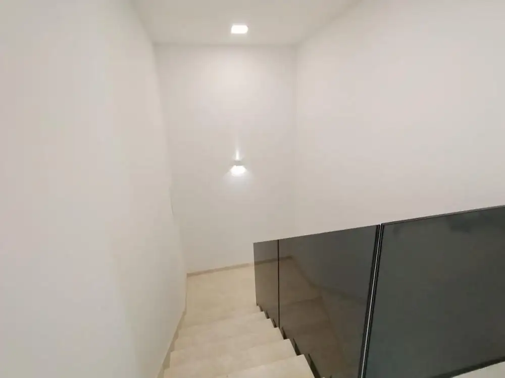 Первый этаж состоит из ванной комнаты без душа со стиральной машиной, кладовой со встроенными шкафами, кухни со столовой и гостиной (концепция открытого пространства), а также одной большой террасы, выходящей на восточную сторону, и одной, выходящей на восточную сторону. запад, с которого мы спускаемся по внешней лестнице на солярий, к пейзажному бассейну с подогревом площадью 32 м2 и зеленому саду.