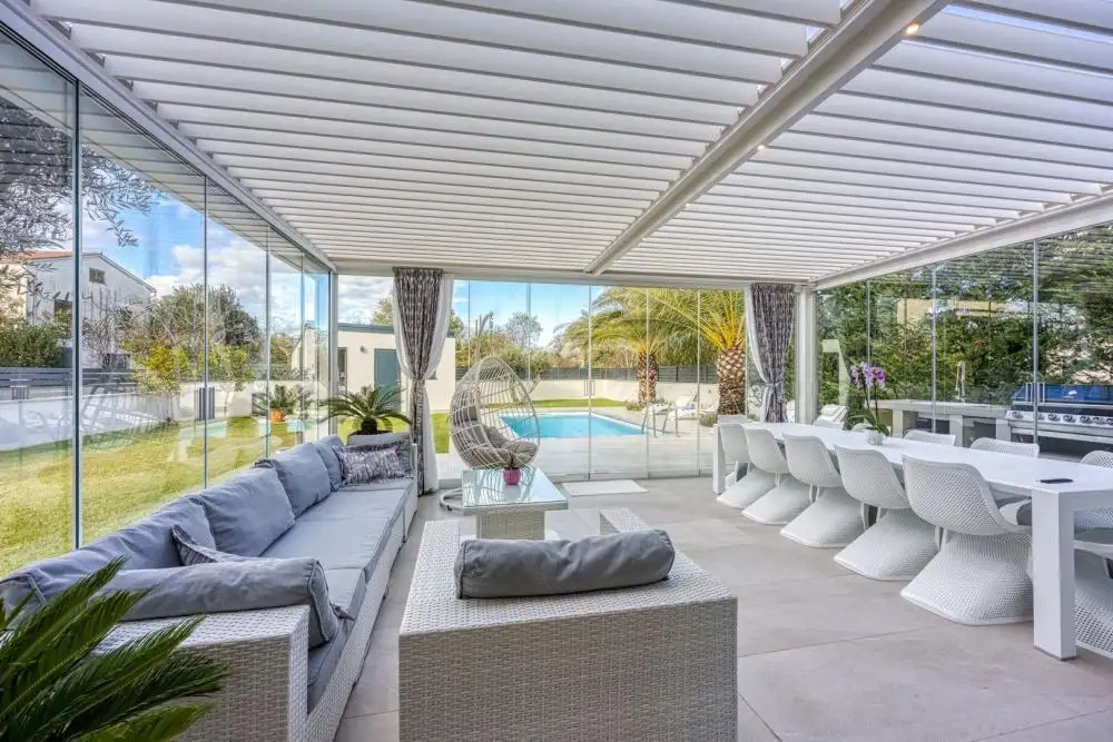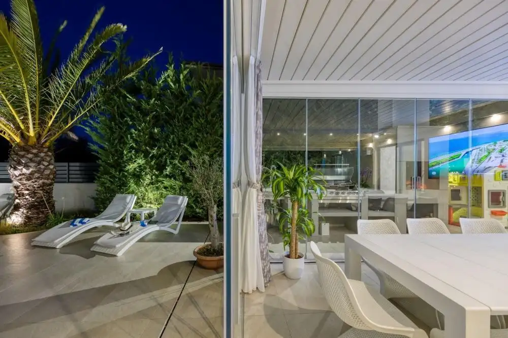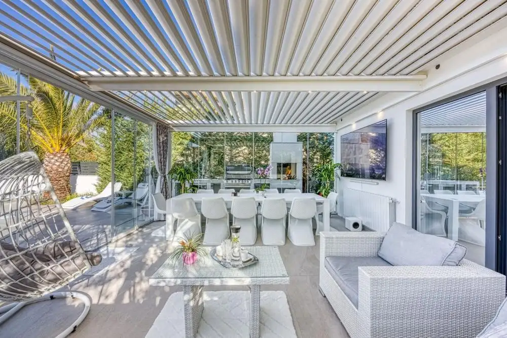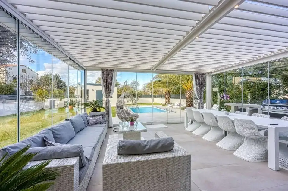 Чтобы сделать пребывание на вилле более комфортным, владельцы изобретательно расширили доступ через кухню к большой крытой открытой террасе, украшенной большими раздвижными стеклянными дверями. Эти двери могут быть полностью закрыты, что позволяет использовать террасу даже в зимние месяцы благодаря возможности обогрева, или полностью открываться в теплое время года, создавая высококачественное открытое пространство с прямым сообщением с остальной частью двора и просторным пространством. бассейн.