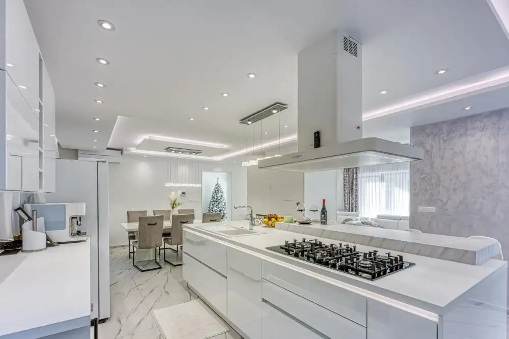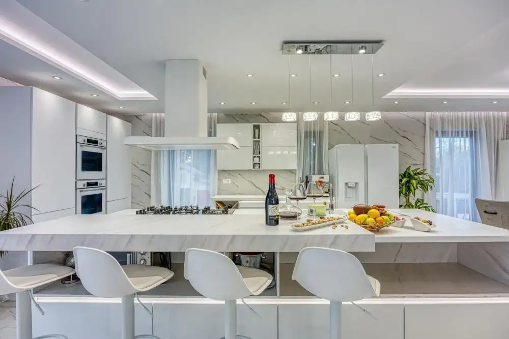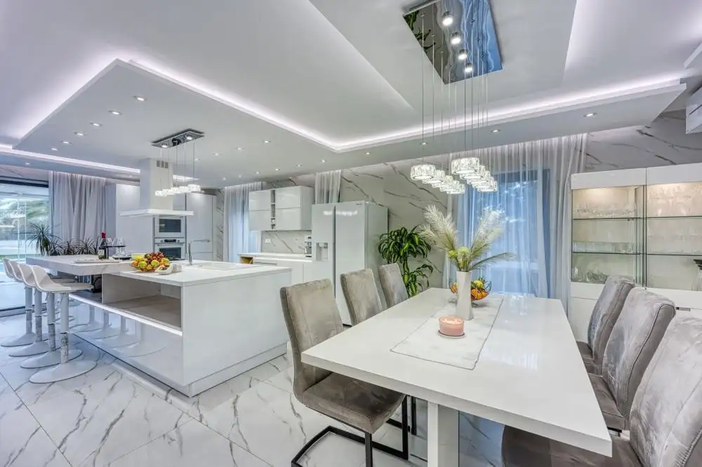 Войдя на виллу, попадаешь в фойе, отделяющее приватное пространство от жилых помещений виллы. Жилая зона виллы задумана как «открытое пространство», где расположена столовая с современной и полностью оборудованной кухней, оснащенной первоклассной бытовой техникой от известного мирового производителя. В дополнение к стандартной бытовой технике на кухне незаметно расположен персональный мини-бар, поддерживающий оптимальную температуру ваших любимых напитков. На кухне также имеется профессиональная газовая плита с высококачественной вытяжкой, расположенная на кухонном острове, идеально подходящем для семейных или дружеских встреч.