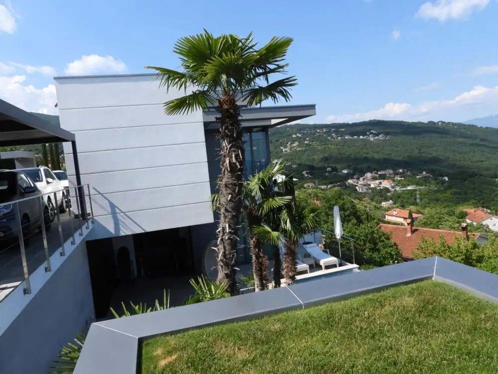 Вилла / дом ориентирован на юг, с большими стеклянными стенами во всех комнатах на южной стороне, так что из этих комнат открывается панорамный вид на весь залив Кварнер.