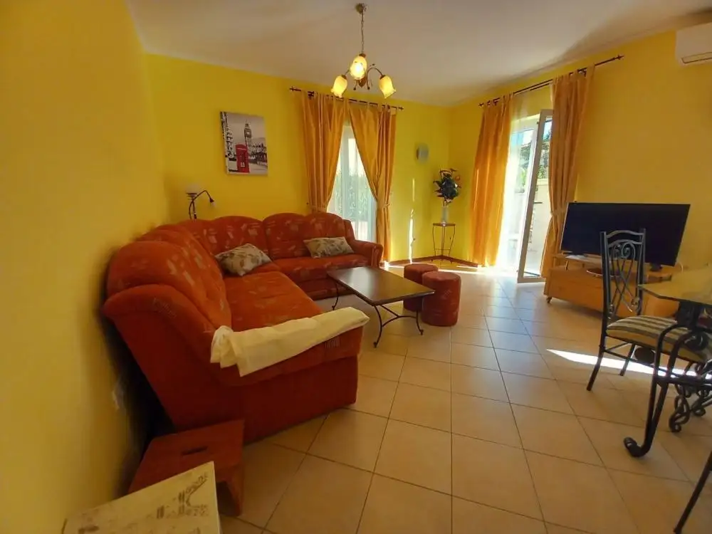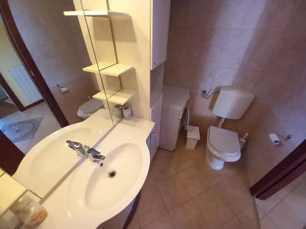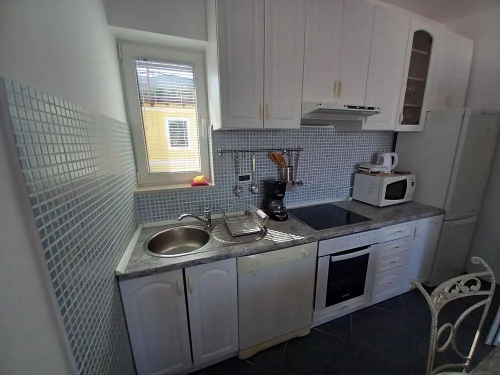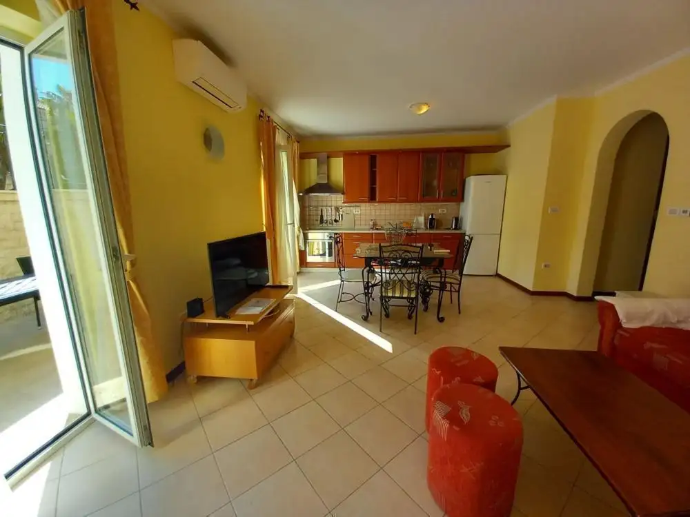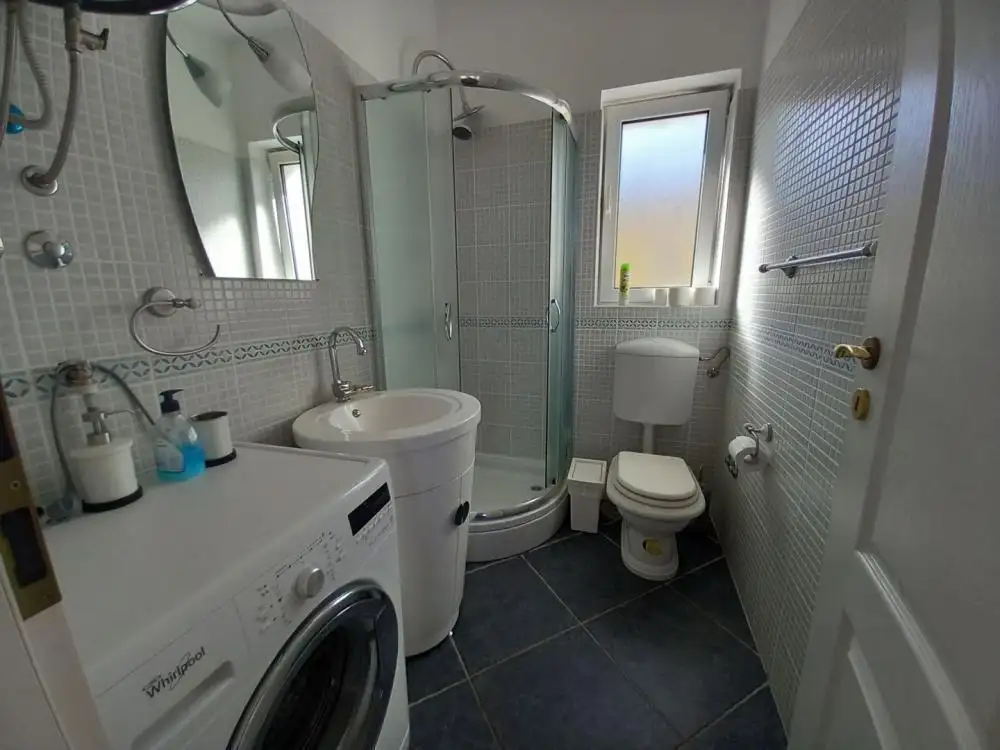 На мезонине расположена двухэтажная большая четырехкомнатная квартира с кухней, гостиной, столовой, двумя ванными комнатами, туалетом, прачечной и красивой террасой. Эта терраса соединена внешней лестницей с окружающей территорией и бассейном. На первом этаже расположена комфортабельная двухкомнатная квартира, состоящая из двух спален, гостиной с кухней, санузла и двух балконов. На втором этаже находится еще одна двухкомнатная квартира такой же планировки и с прекрасным видом на Кварнер.