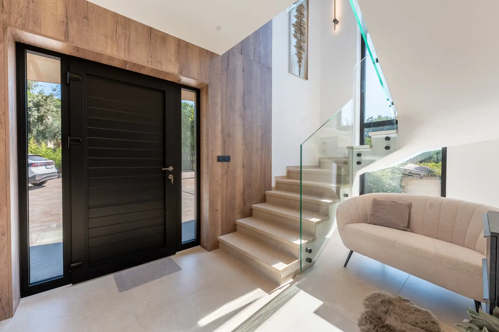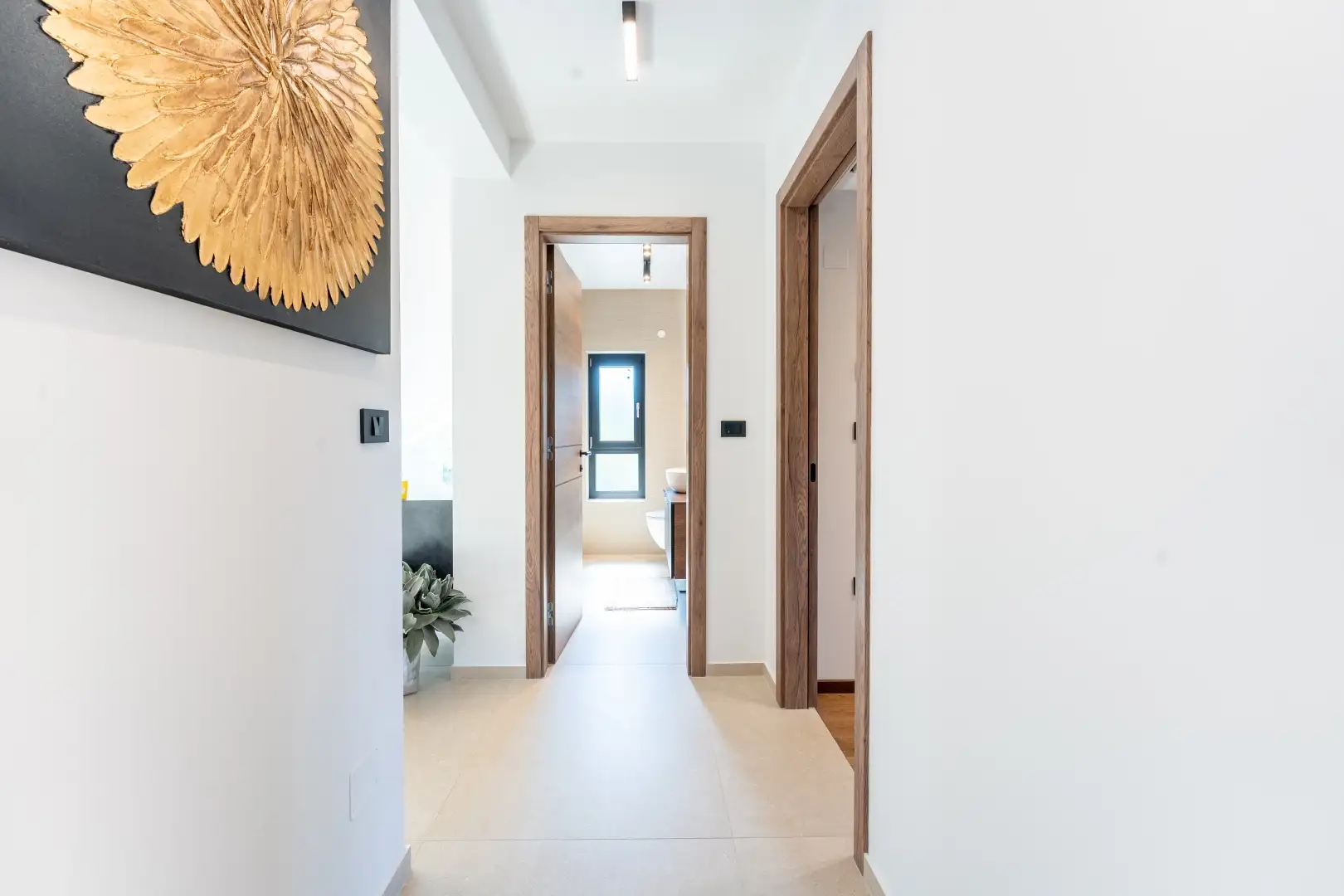 Благодаря каскадному рельефу, вилла расположена на трех уровнях. На верхнем уровне входа вас встречает большая частная парковка. Этот этаж включает в себя входной холл с встроенным шкафом, две просторные спальни — каждая с собственным санузлом — и туалет для гостей.