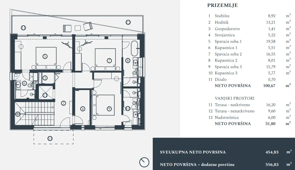 Первый этаж: три спальни, каждая с отдельной ванной комнатой, и большая терраса.