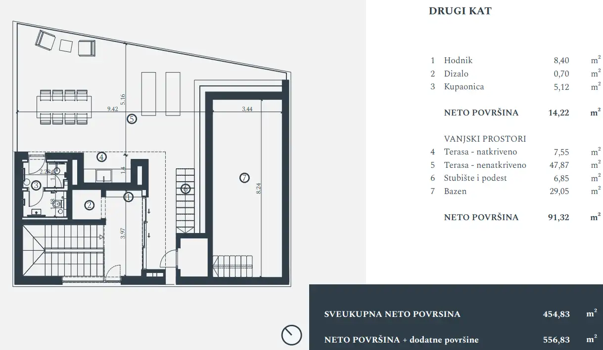 Третий этаж: ванная комната и просторная крыша с частным бассейном.