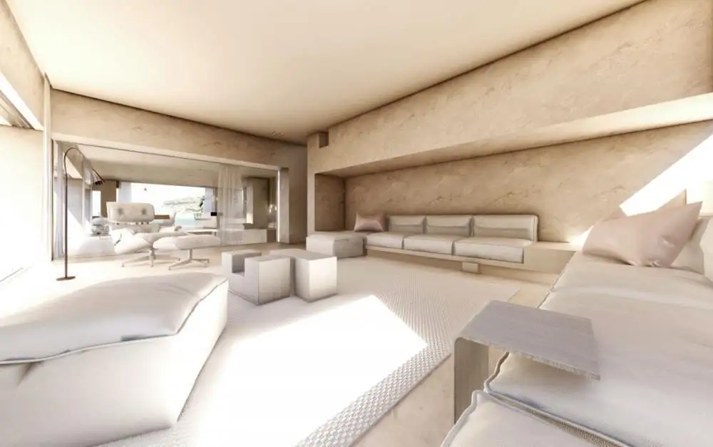 Уровень 0: прихожая, лестница, гостевой туалет, огромная гостиная с кухней, бар, столовая, гостиная и терраса с видом на море.