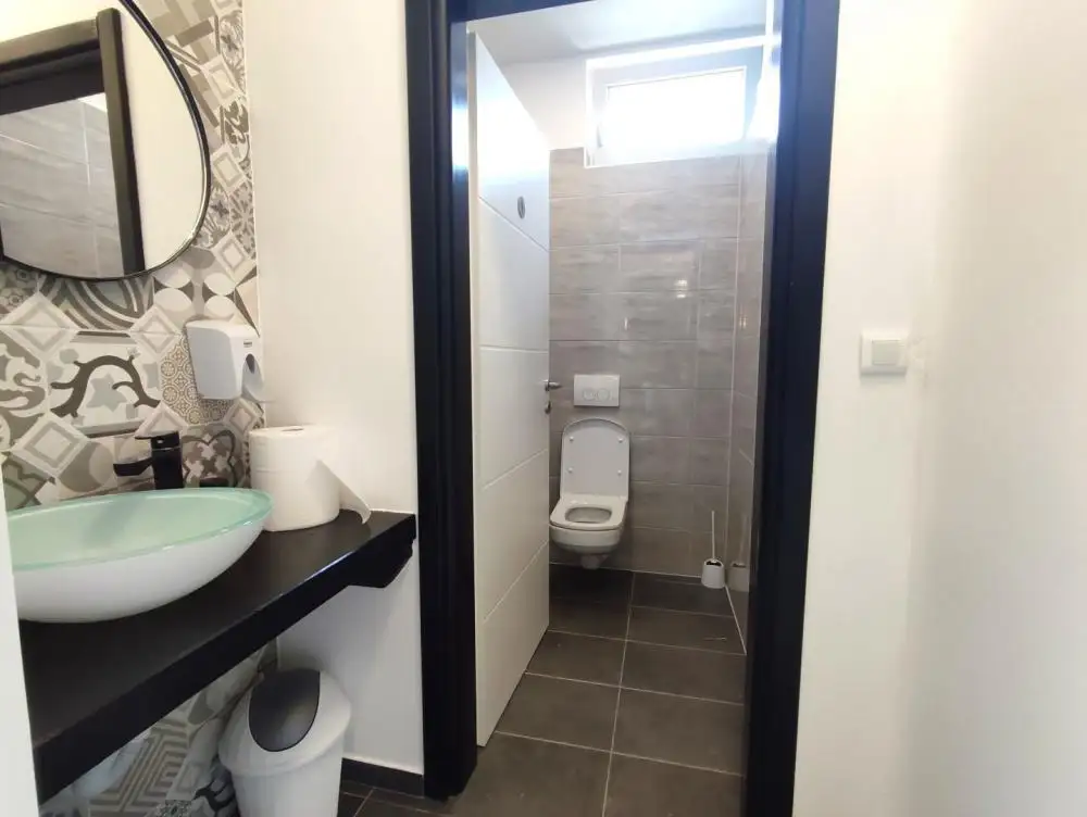 Спускаемся по внешней лестнице на нижний этаж, который служит таверной/комнатой для общения. Он состоит из большой открытой площади, 3 ванных комнат, бара, полностью оборудованной кухни, большого камина и открытой террасы площадью ок. 60м2.