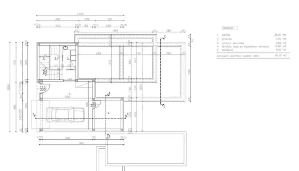 Вилла будет состоять из подвала, цокольного этажа и первого этажа. В цокольном этаже будет гараж, прачечная, кладовая и техническое помещение. Внутренняя лестница ведет на первый этаж, где будет кухня со столовой и гостиной, спальня, ванная и туалет. Из гостиной есть выход на крытую террасу с летней кухней, соединенную с бассейном, пляжем и садом. На первом этаже будут две спальни, каждая со своей ванной комнатой и выходом на террасу.