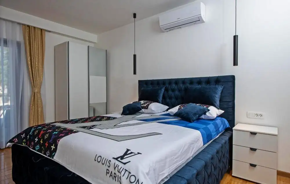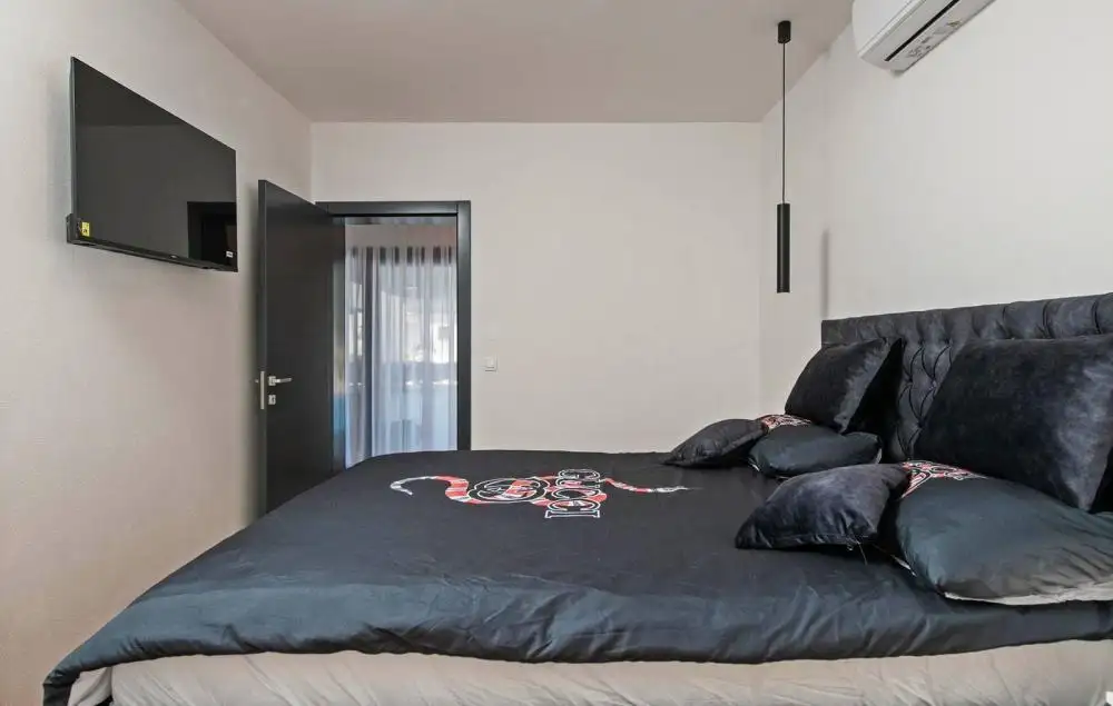 На вилле столярные изделия с трехслойным металлизированным стеклом, ламинированные внутренние двери и входные двери с защитой от взлома. Благодаря большим стеклянным поверхностям дневной свет используется по максимуму. Концепция Г-образного плана этажа четко определена. Он спроектирован как две отдельные жилые единицы дневного и ночного пространства, которые можно объединить с помощью большой террасы. Жилая зона состоит из кухни и столовой с гостиной, а ночная зона состоит из трех спален с отдельными ванными комнатами. Планировку дополняют прихожая, гостевой санузел, постирочная и техническое помещение.