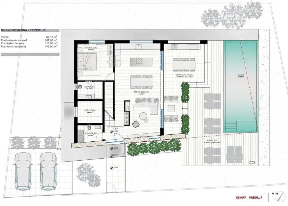 Благодаря своей скромной архитектуре он не нарушает окружающую среду, а создает синергию природной среды, традиционной истрийской архитектуры и современного дизайна. Традицию символизируют камень и двускатная крыша, а современное выражение — стеклянная стена большого формата.