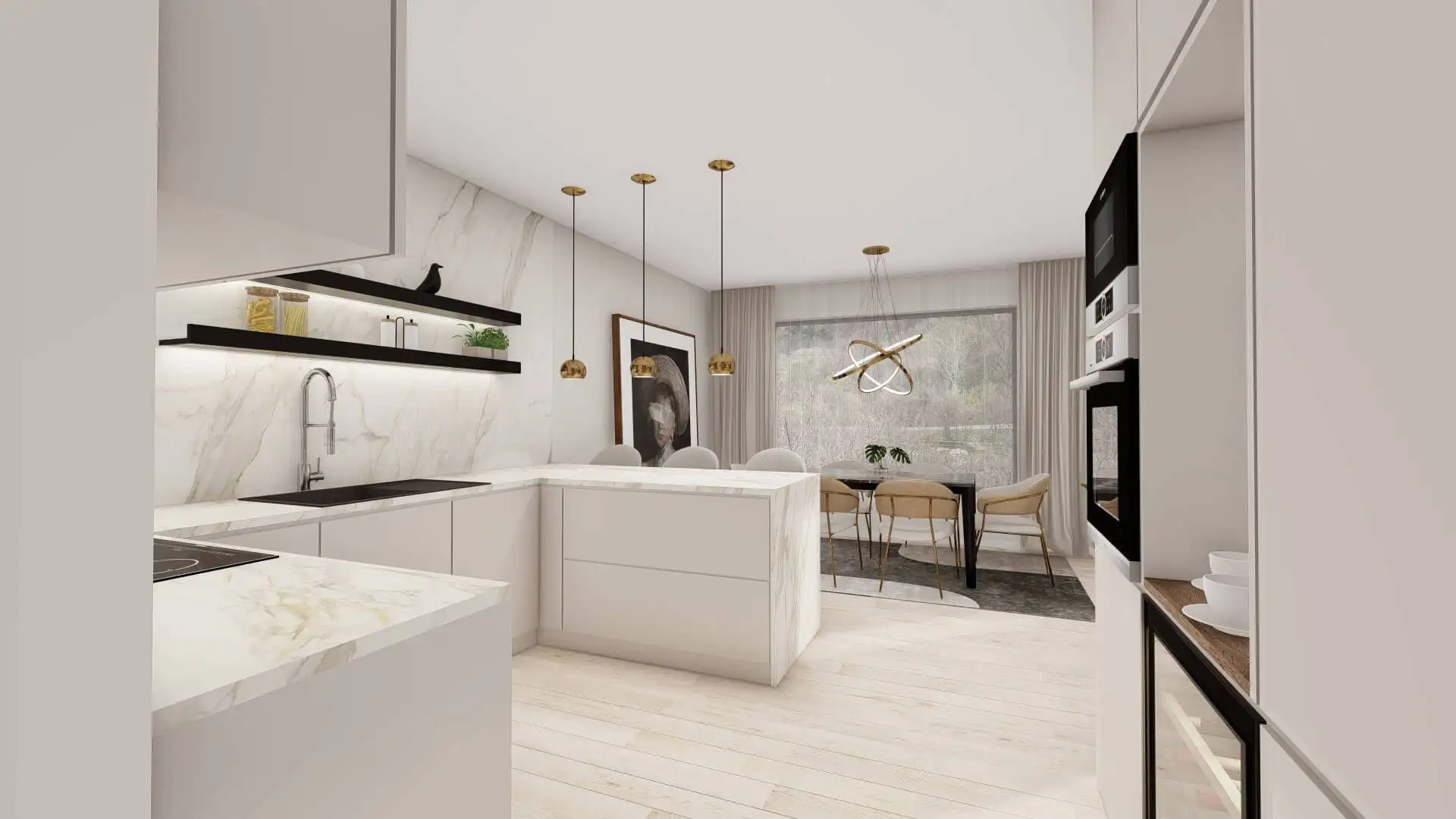 Первый этаж каждой виллы состоит из: прихожей, гостиной с обеденной зоной, туалета, лестницы, крытой террасы и открытой террасы с бассейном.
