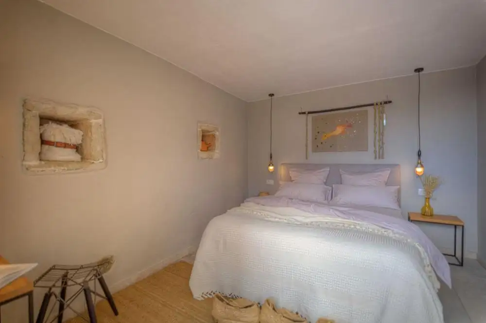 Он был полностью отремонтирован в 2017 году и состоит из первого и второго этажей. Вход на первый этаж очарует вас своей полнотой и в то же время простотой красивого просторного пространства, сочетающего в себе полностью оборудованную кухню, столовую и гостиную. Также имеется одна из трех спален с отдельной ванной комнатой и выходом к пляжному бассейну. Наверху находятся оставшиеся две спальни, красиво оформленные с большим вниманием к деталям, удобные, а также с отдельными ванными комнатами. Первый этаж ведет на открытую террасу, с которой открывается прекрасный вид на окружающий пейзаж и море. Всего в доме 136 м2 жилой площади, а вопрос отопления и охлаждения решен с помощью кондиционеров и полов с подогревом во всех ванных комнатах. Под домом находится красивая подсобная постройка площадью 20 м2 с кухней и обеденным столом с прямым видом на бассейн.