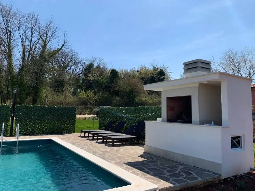 Внешний вид дома также состоит из бассейна 24 м2, летнего душа и небольшой летней кухни с барбекю.