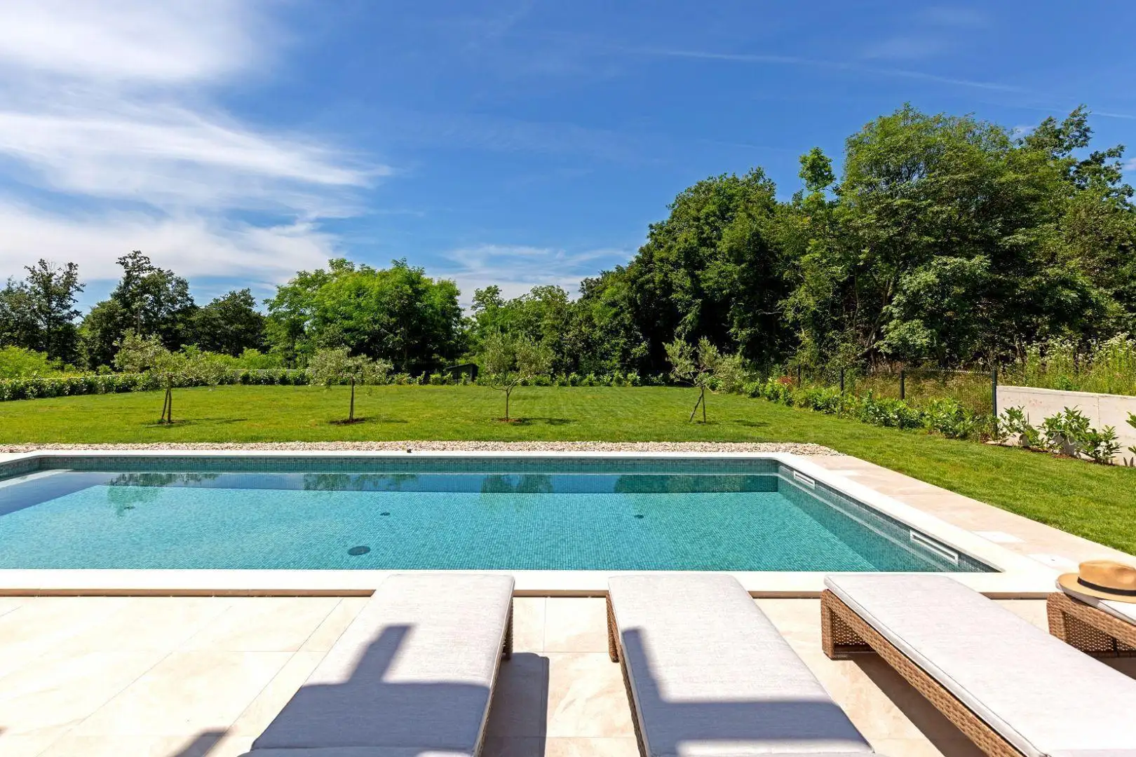 Ландшафтный двор с бассейном площадью 40 м² и солярием предлагает полную гармонию.