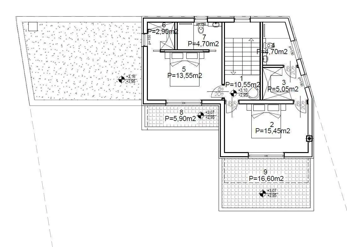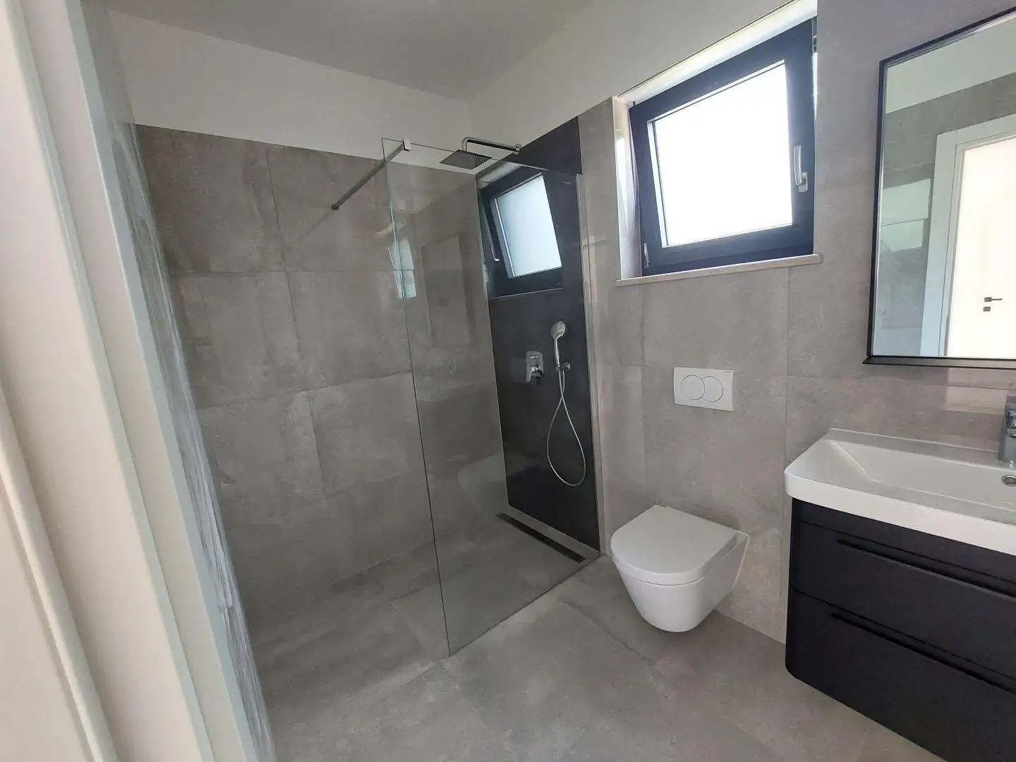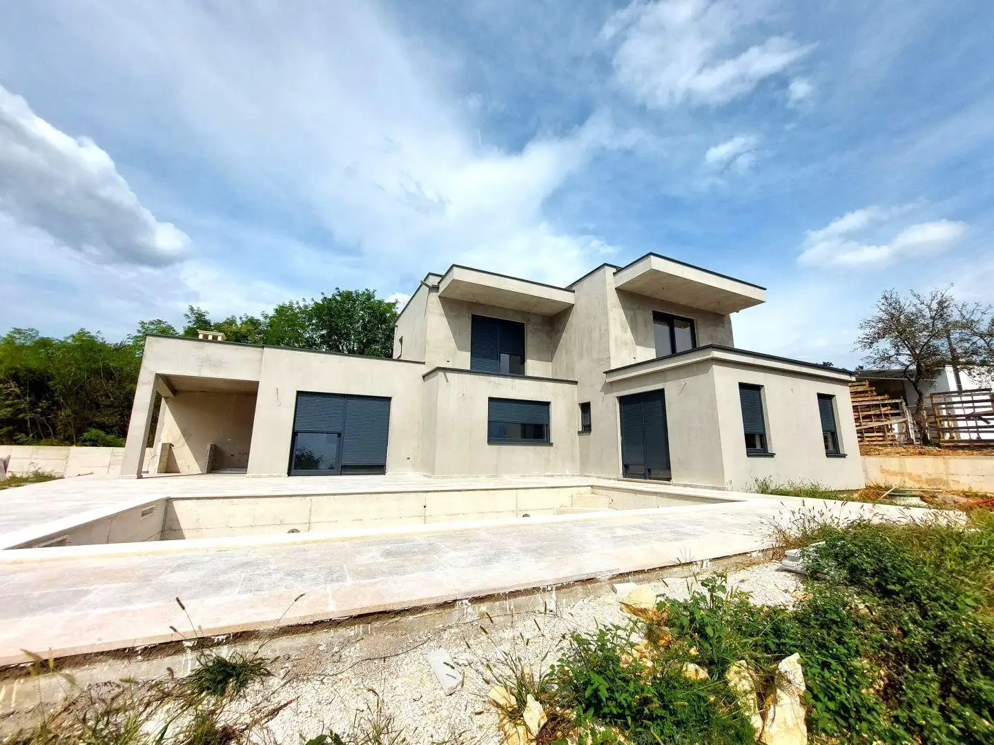 Наверху есть две просторные спальни, каждая со своей ванной комнатой, гардеробной и открытой террасой. Дом будет отапливаться кондиционером и теплым полом. В настоящее время конструкция находится под крышей с установленными столярными изделиями, и ожидается, что строительство будет завершено в начале 2024 года.