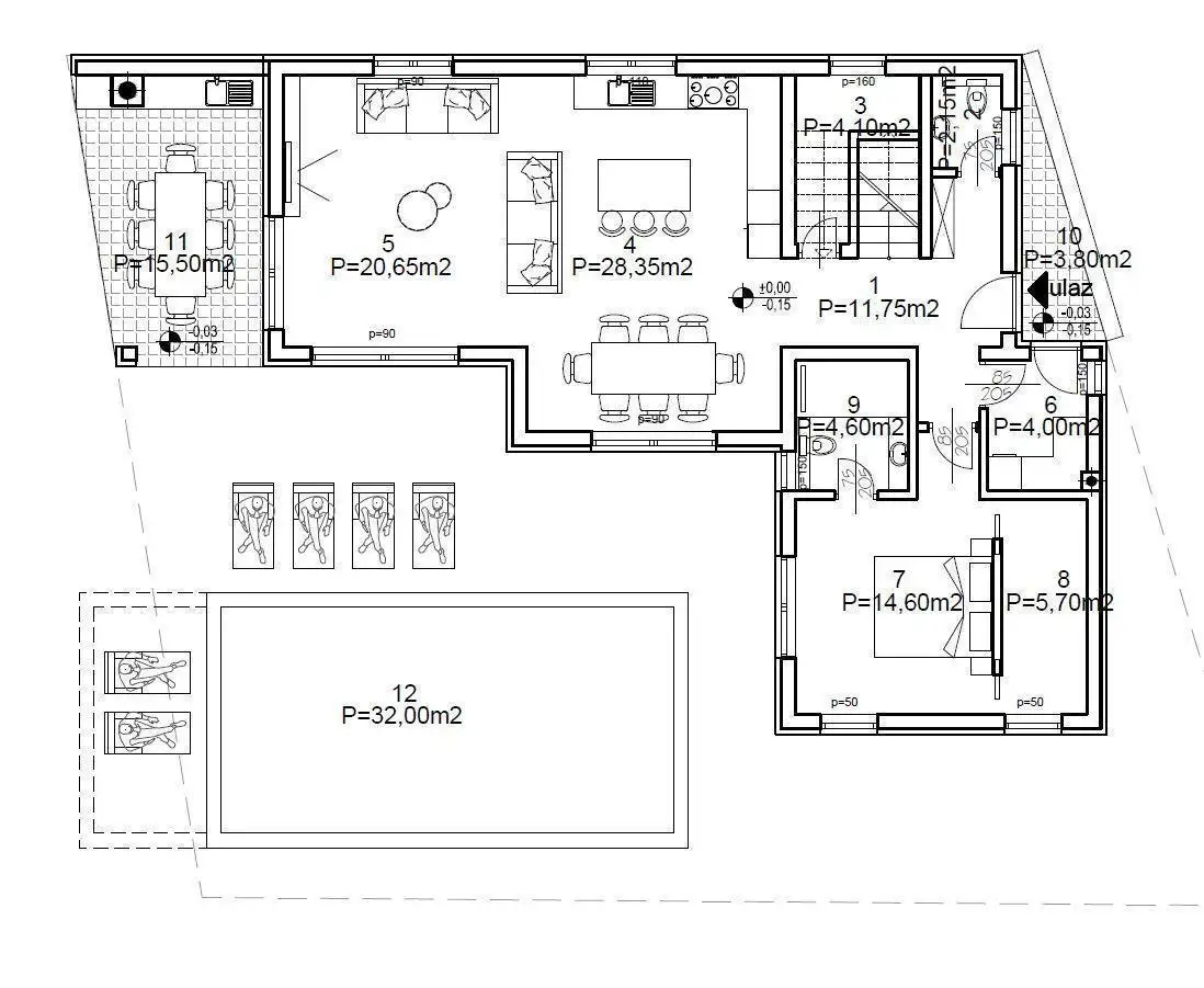 Вилла занимает два этажа. На первом этаже находятся кухня, гостиная со столовой, туалет, кладовая, спальня с гардеробной и ванной комнатой, прачечная и две открытые террасы. На одной террасе будет летняя кухня, а другая ведет к бассейну площадью 32 м².