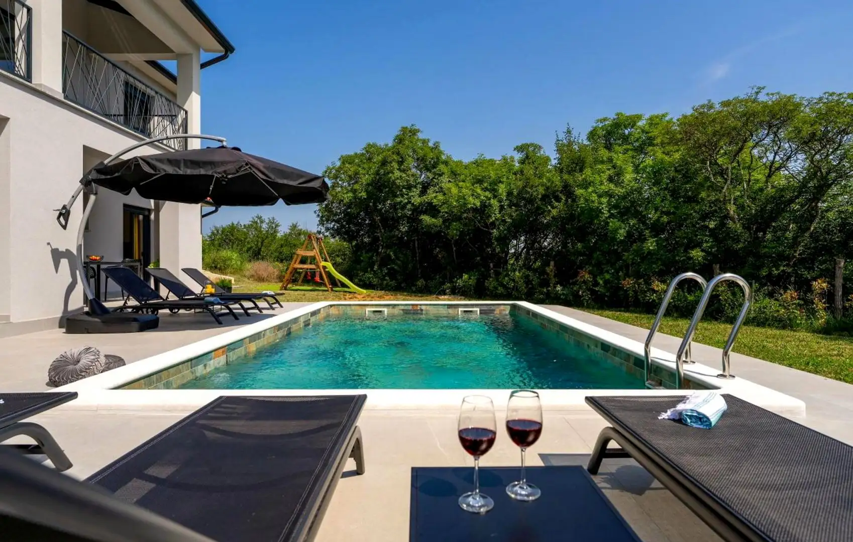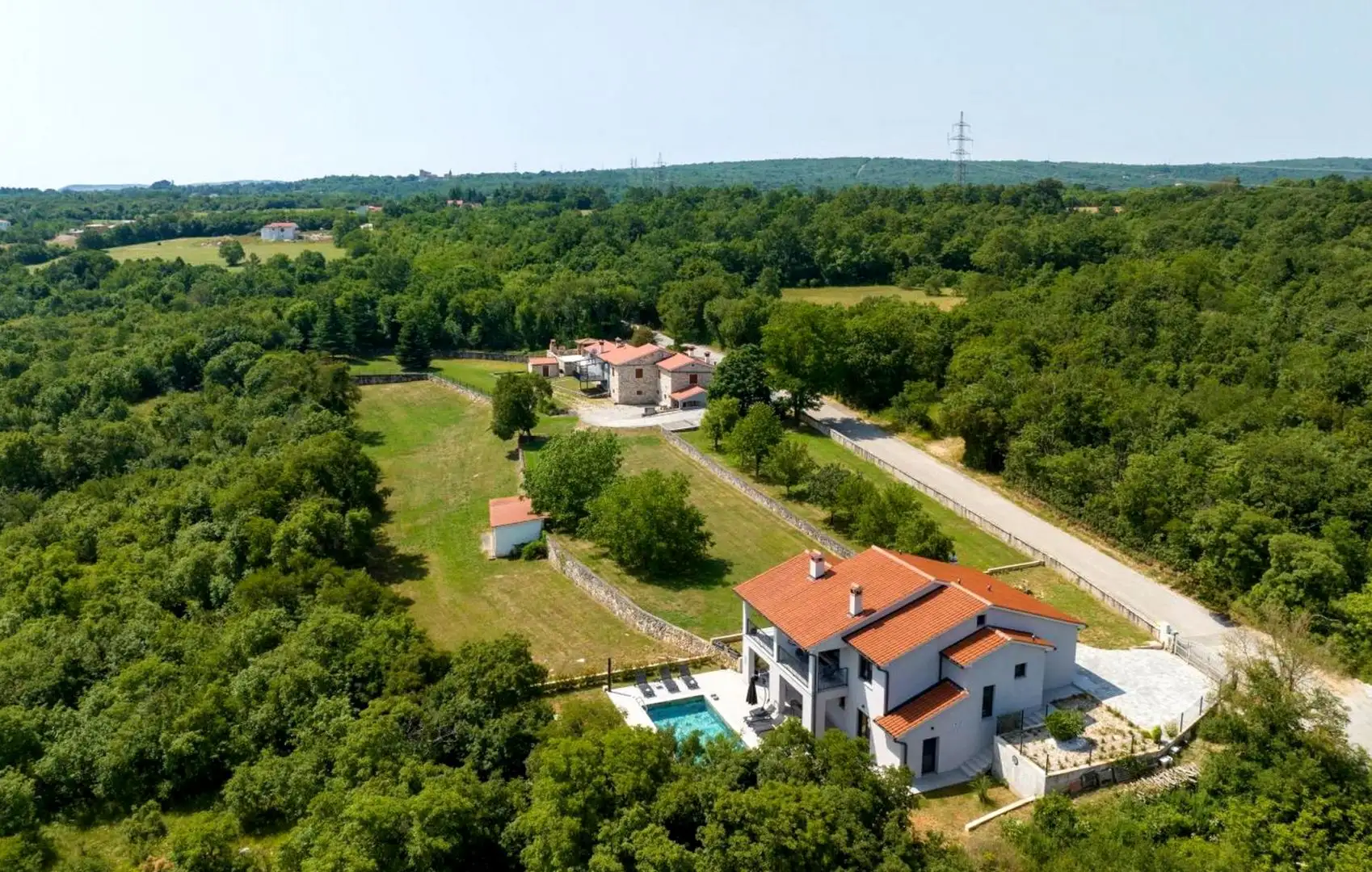 В окрестностях Лабина продается новая вилла площадью 167 кв.м. на участке 800 кв.м. с бассейном, расположенная на краю деревни всего в 7 км от моря.