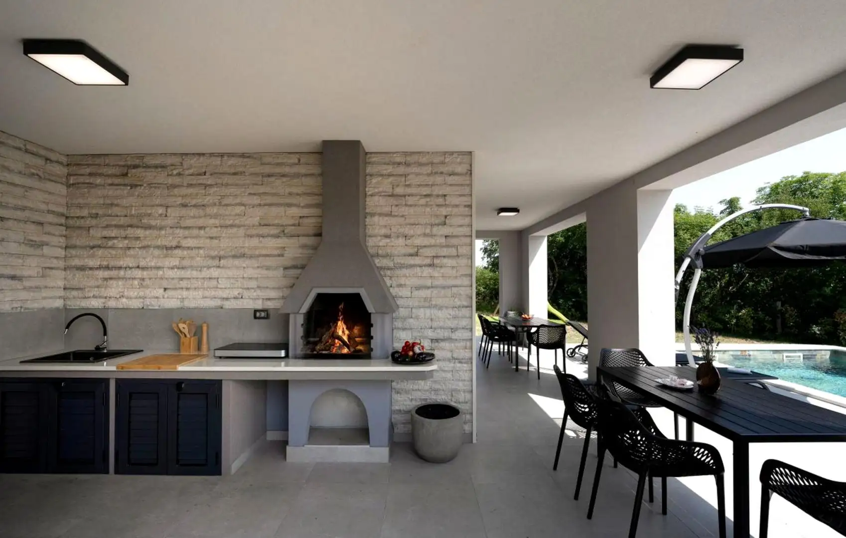 Нижний этаж предлагает две спальни, каждая из которых имеет собственную ванную комнату, и дополнен крытой террасой с летней кухней и выходом в гостевой туалет.