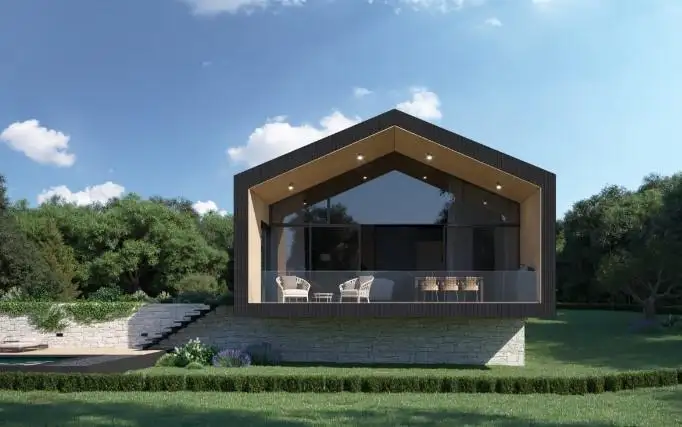 Современные концептуальные дома с бассейнами во внутренних районах Истрии в деревне Кухари недалеко от Пазина.