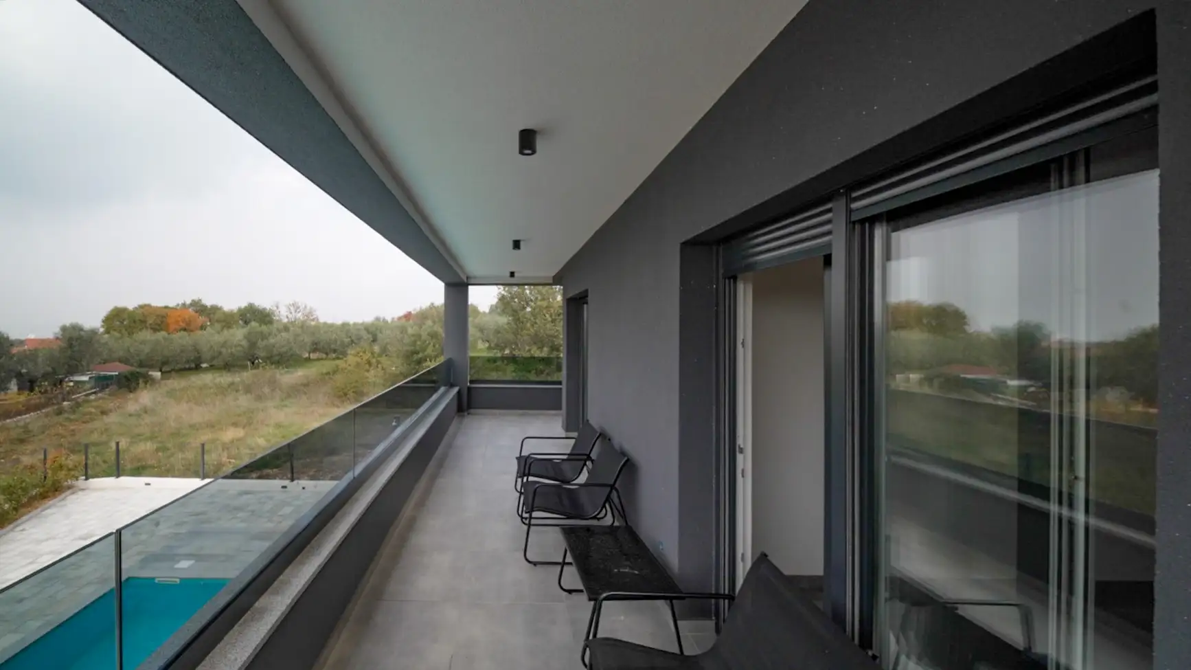 Большие стеклянные стены пропускают обильный естественный свет и открываются на виды на море и окружающую зелень, соединяя открытую гостиную и кухню с внешней средой. Современные системы, такие как теплый пол, электрические жалюзи и встроенные москитные сетки, обеспечивают комфорт в течение всего года.