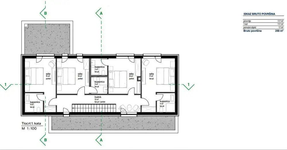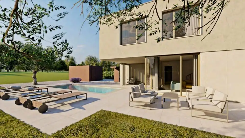 Центральное место занимает бассейн площадью 28 м² с зоной для загара, а рядом с домом также находится вспомогательная постройка площадью 17 м².