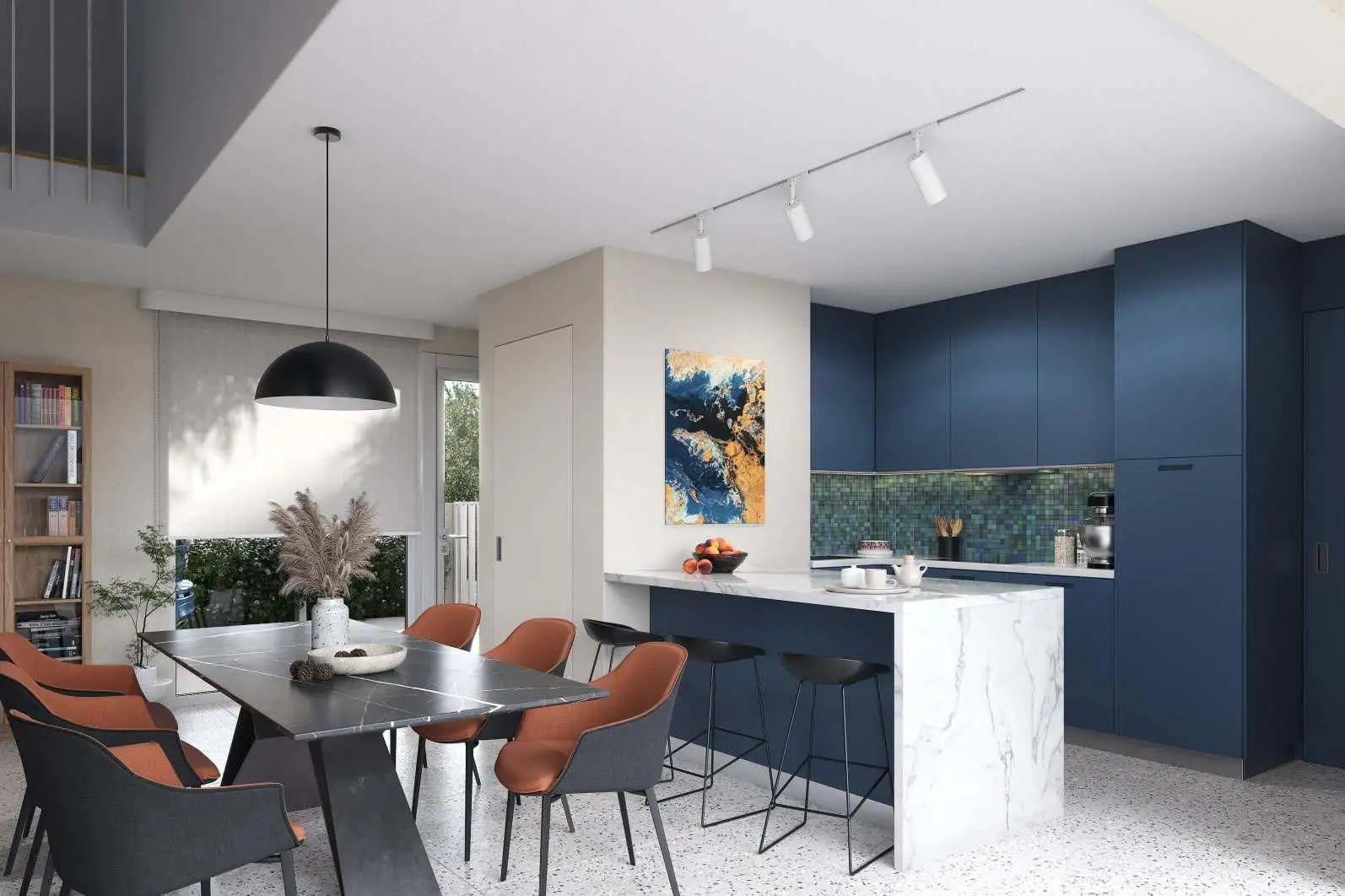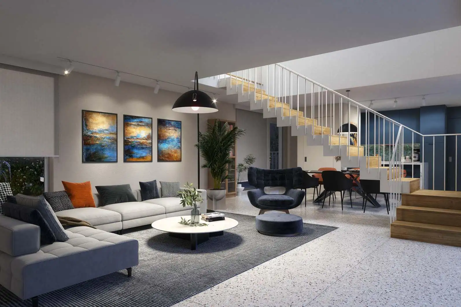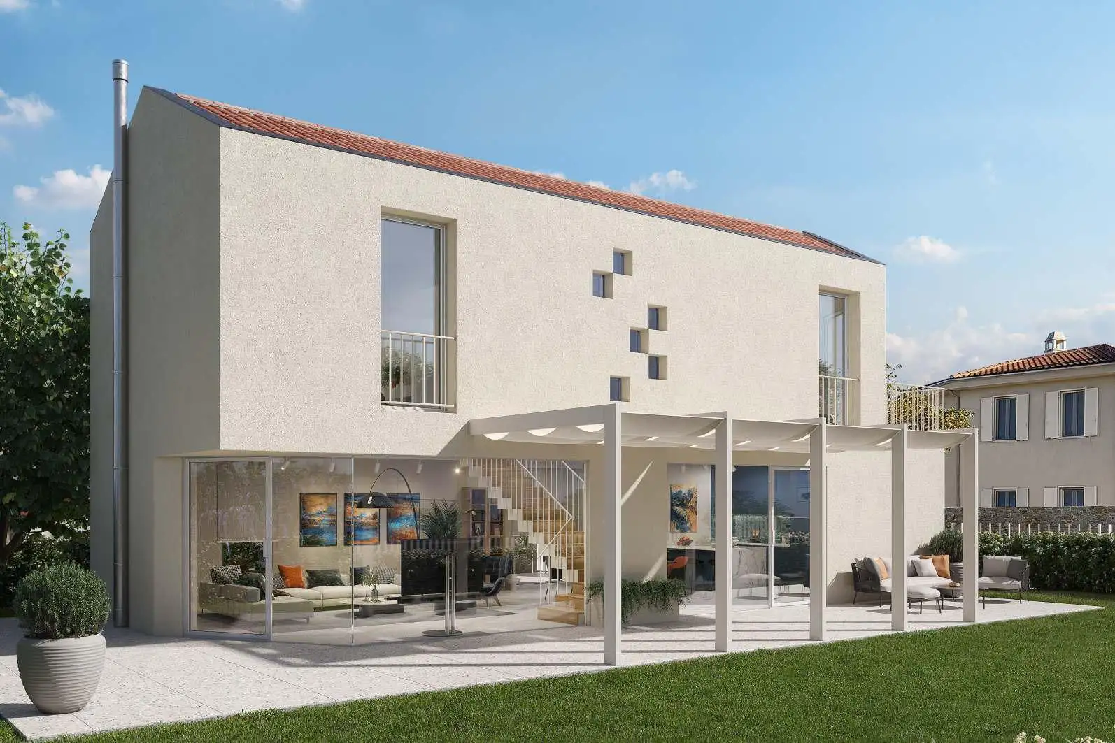 На первом этаже расположены просторная кухня с кладовой, гостевой туалет, большая столовая и гостиная, выходящая на щедрую террасу, идеально подходящую для летних вечеров.