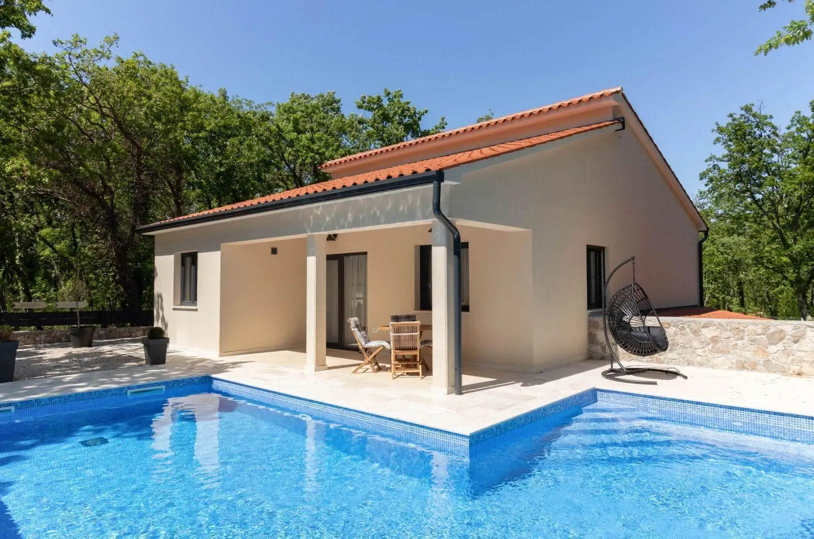 В окружении зелени в спокойной деревне недалеко от Лабина и Рабаца выставлена на продажу безупречная вилла с бассейном в уединенном месте.