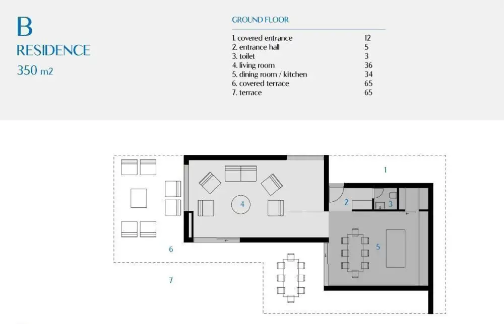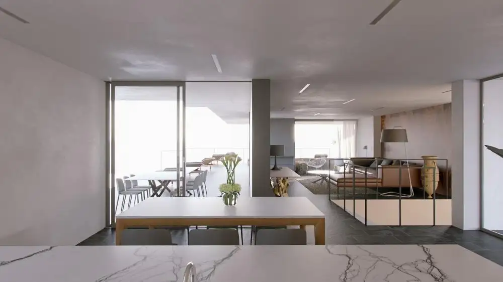 На первом этаже мы находим гостевой туалет, открытую гостиную с кухней и столовой с выходом на террасу и к бассейну.