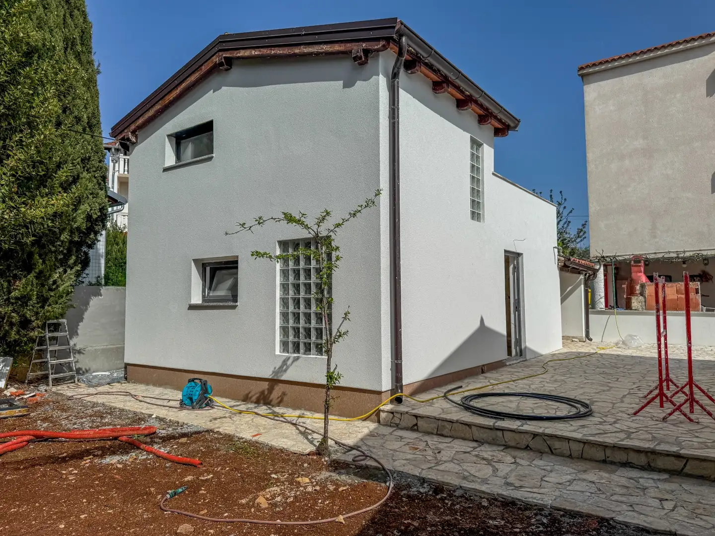 Частный сад обширный и красиво оформленный, с террасой и бассейном, создавая идеальные условия для жизни на свежем воздухе и летней уединенности. Недвижимость готова к немедленному заселению, без дополнительных вложений.